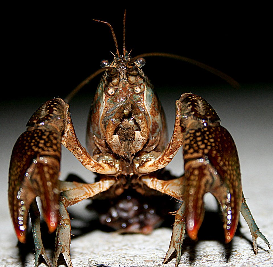 I had Mander drive me to Huntington and drop me off for the weekend so she could use the car.  I brought a few things for Big Blue (my little “under repair” camper – when finished, a before and after blog will be posted) and figured I would sleep in the hanger.  Friday night was my first all-alone overnight at the hanger.  A few of us hung out for a while and then when the last one (Bobby) bid his goodnights, it was just me.  Wow, that hanger has some great acoustics.  The rain started soft at first and then built up to an angry pelting.  The hanger is located close to an active railroad and somewhere in the middle of the night I heard a growing noise and wrote it off as a train coming down the tracks.  The sound grew louder and louder and suddenly the two garage doors at the front of the hanger started a heavy rattling and the building shook a bit.  It was this amazing wind that was just loud and angry and wicked.  Once the wind died down and the steady thrum of a soft rain started, I drifted off and slept like a baby (and maybe snored like a trucker).   Dawn broke and through the window over the door, I could see the morning come to full light.  The patter of the rain would fade in and out.  And, like the rain, I faded in and out of sleep.  I was having a rather intense dream in which Sigourney Weaver and I were battling just-born aliens in the space lab.  As I woke up, I thought – holy shit that was so real!  Then I heard it – the skittering clawing sound as little bird feet scratched along the metal roof.  It sounded just like the baby aliens in the movie and was just enough to wake me up soundly!  Saturday was a wash (literally) as far as jumps go.  The whole morning rotated between showers and storms – dark, ominous and always threatening skies.  Andy and I worked a little on my camper (air conditioner in the window – check).  Saturday night found me sleeping in the hanger again.   – Checking the weather, we were pleased to see a forecast of sunshine by no later than nine-ish.  Before everyone settled in for the night, we had a visit from one badass crawdad…