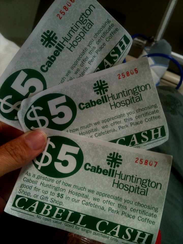 After a bit, Bobby was sent for X-rays. As they wheeled Bobby from Exam Room 8, tears started to fall uncontrollably. I would wipe them away and they would return. It was an endless fountain. And because a high volume of traumas is generally a magnet for the odd and bizarre – while waiting for Bobby’s return I was confronted with a zombie (complete with a shuffle-drag of one foot and partial scalping due to an ATV accident). He stood in the doorway and stared at me. Had he muttered “brains” I would have pelted him with a bedpan. Because my stomach must be connected directly to my nervousness, once Bobby had left for X-rays I made my way to the bathroom across the hall and donated the contents of my stomach to Cabell Huntington Hospital. I needed a drink of something to clear the palate. Standing in front of the machines, fidgeting with the money that refused to go in the machine, I had some young man open the men’s restroom door and whisper “heeeey. heeeeeyyyy. come here.” Absolutely no end to the entertainment folks! WAS there a full moon?