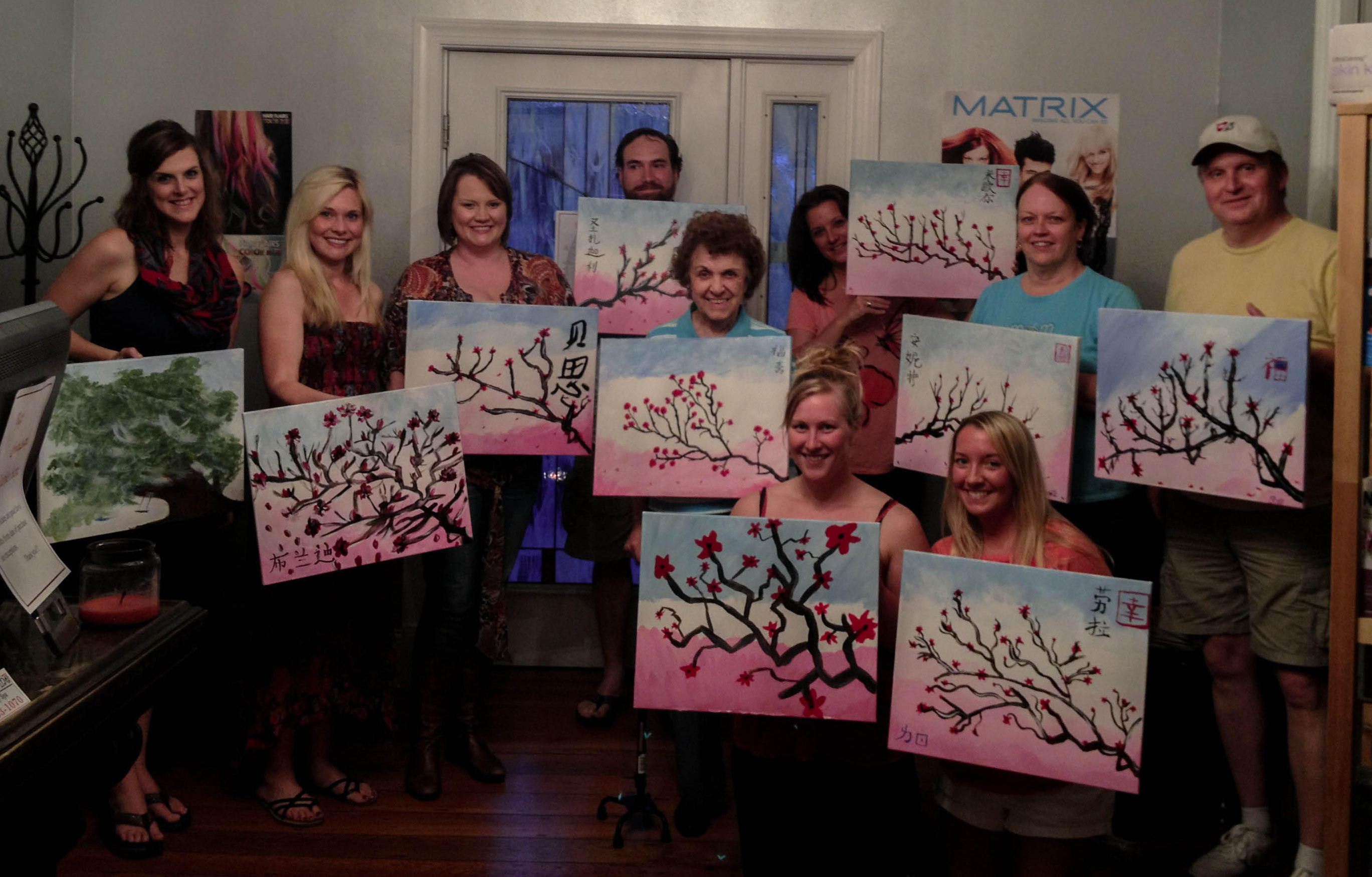Sassa took us through the (really simple) steps: white, blue, pink, blending – strong branch, tapered branch, black under accents – Chinese letters and red stamp – red blossoms, black center dot – white accents. Viola! Personal Masterpiece: