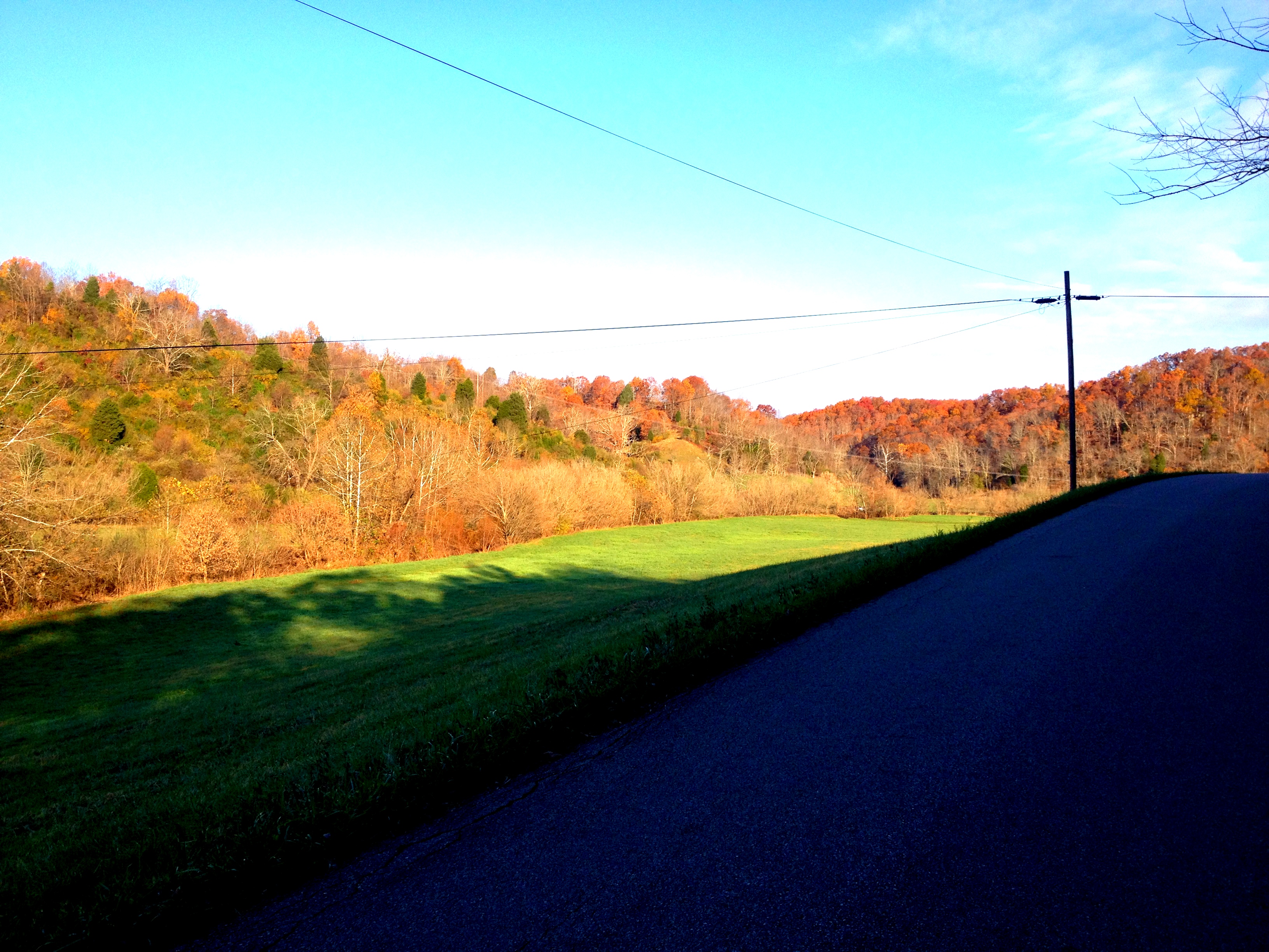 Then we were being herded to the starting line (which doubled as the finish line too – for walkers, we went until we saw the water table and then turned around and came back, for the 10k, they had to go further down the road but eventually returned once reaching their halfway mark). This race does not have separate start times for the various categories. So all the colors were intermingled on the road waiting for the go ahead. I was in the front of the middle. The person in charge said those amazing words: Ready, set, go! A lot of people ran past me, their greens and reds showing brilliantly in the autumn sun. And then I sat off at my own decent pace. The route is hilly and has some winding turns and I immediately found myself on an incline. I decided to fall in behind another walker who had a moderate-to-quick pace. By keeping time with her, the first incline was a breeze. In my ears, House of Pain was singing “Top O The Morning To Ya”. I was singing along, looking out to my right along the mountain ridge at the gorgeous splash of colors against a blue morning sky. Then a smell hit me and I looked to my left to see that I was quickly approaching a cattle barn. I’m still singing along with HOP: