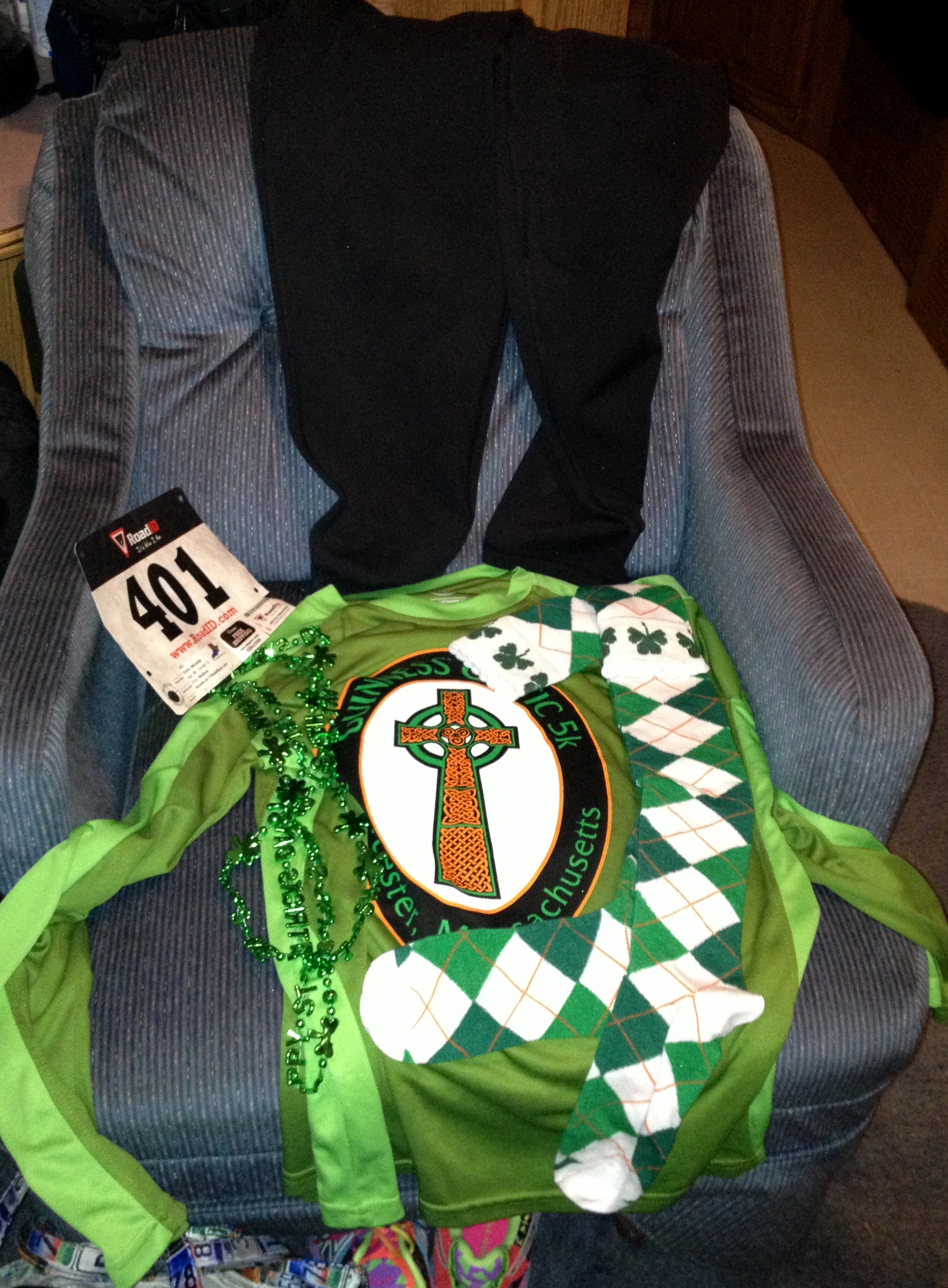 The race was a great time. The clouds had threatened rain all morning and at the end, eating a banana on the curb, I felt the first few raindrops of the impending storm. I ran the race with Mander. Well, let’s say I started this race with Mander. She quickly left me in the dust. I enjoyed that aspect of the race tremendously (and it is the beginning of our training for the Marshall Half in November). At the finish line they threw dixie cups full of green glitter at us (from both sides so it couldn’t be avoided). Fortunately I had a long sleeve shirt on and diverted the majority of the sparkly happiness.