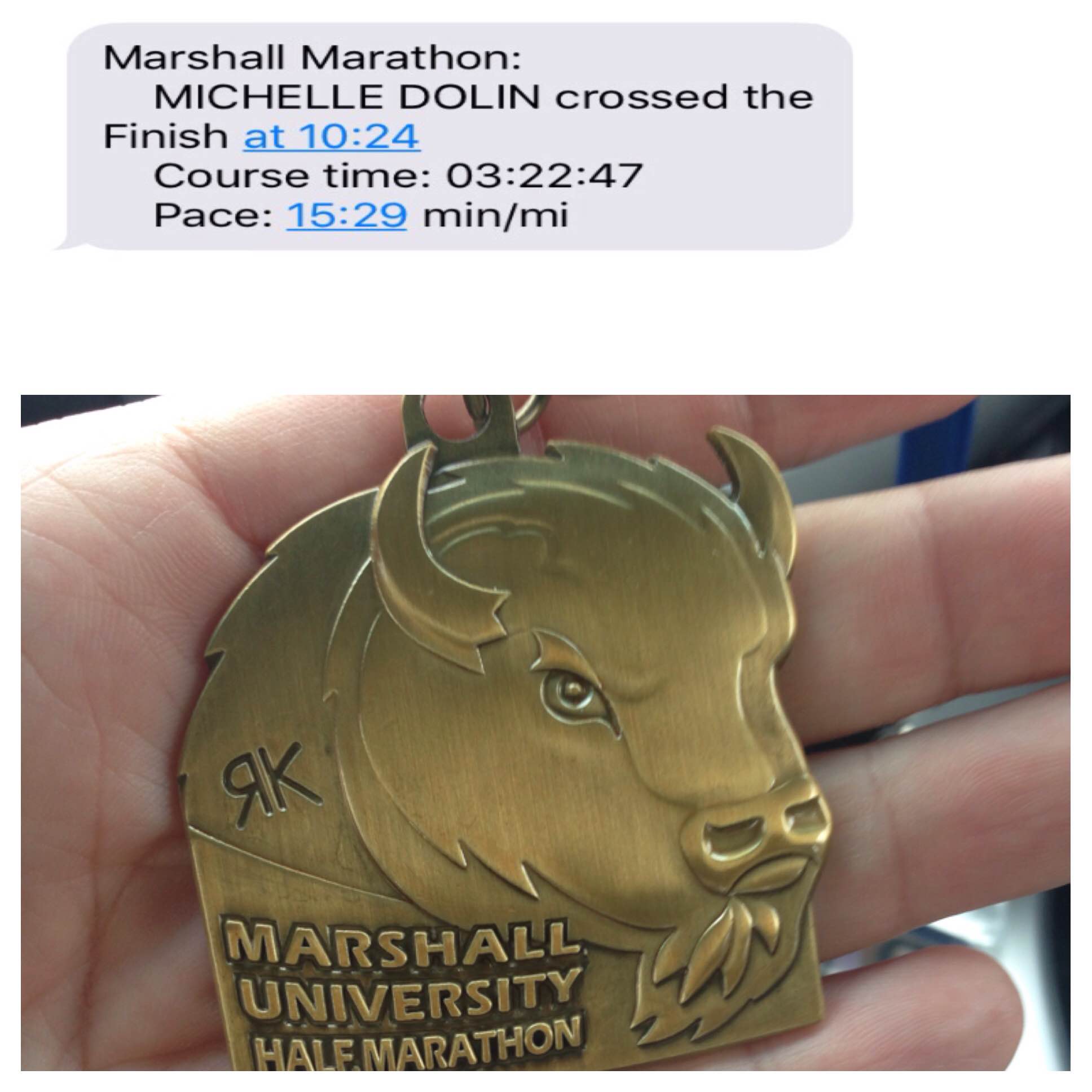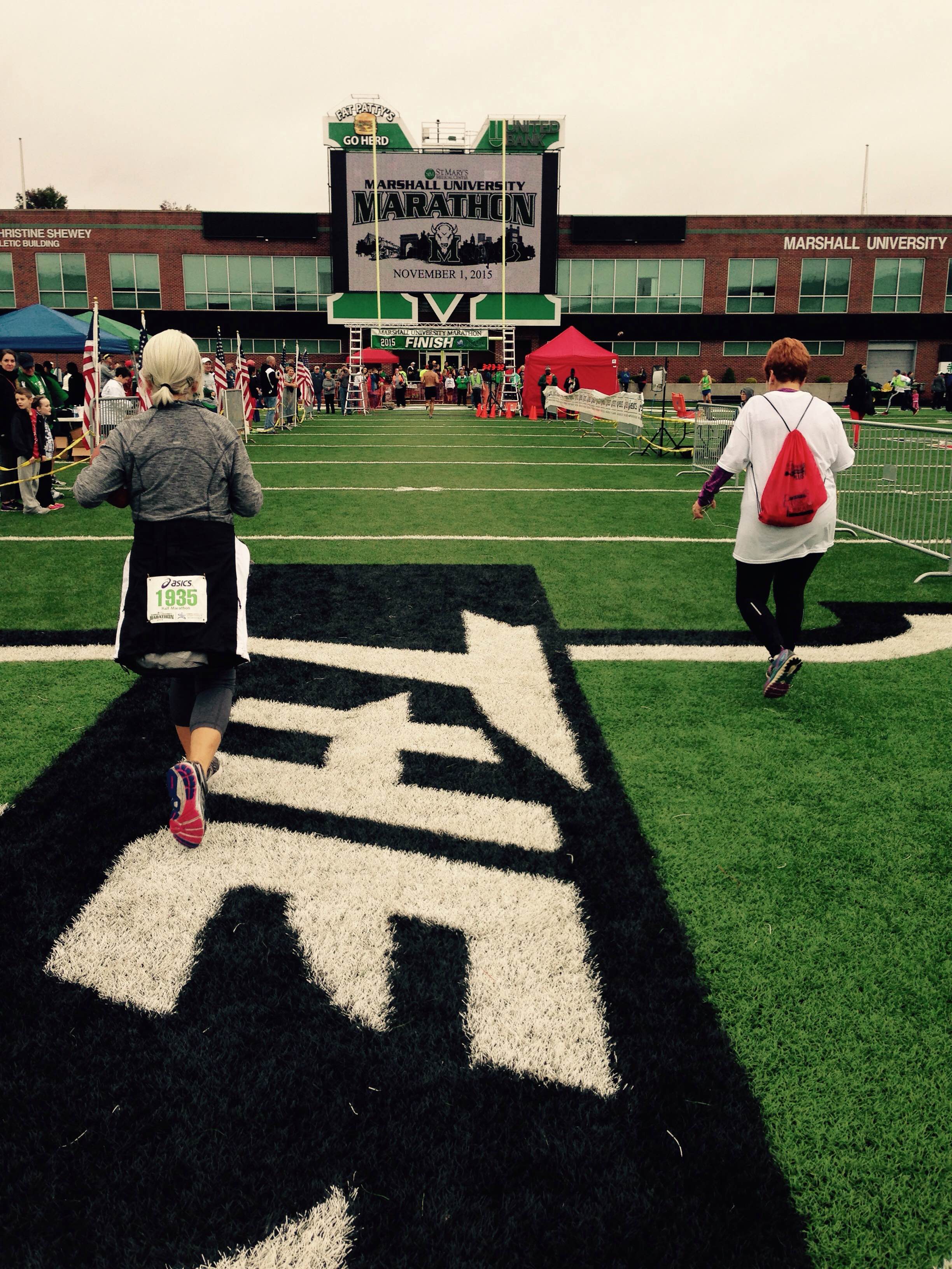 2015 was not a runner-fun year for me.  May 16, 2015 I ran the Gallipolis in Lights 5k with a time of 46:14 and felt as if I would die the entire way. May 18th I was (finally) diagnosed with Plantar Fasciitis that included a small heel spur.  For three weeks in June I met with various podiatrists and ortho specialists.  I was also fitted with inserts to accommodate my high arches and to ease the pressure on my heel.  June 22nd I received a cortisone shot and was cleared to start running again (the following week) with the warning that it would be a while before my foot would be 100% (if ever).  This will be a recurring injury that I will undoubtedly suffer through again in my lifetime (yay me).  I registered on June 29th for the Marshall Half Marathon because I refused to believe that my left heel, only a 4”x4” area of my body, would keep me from running again.