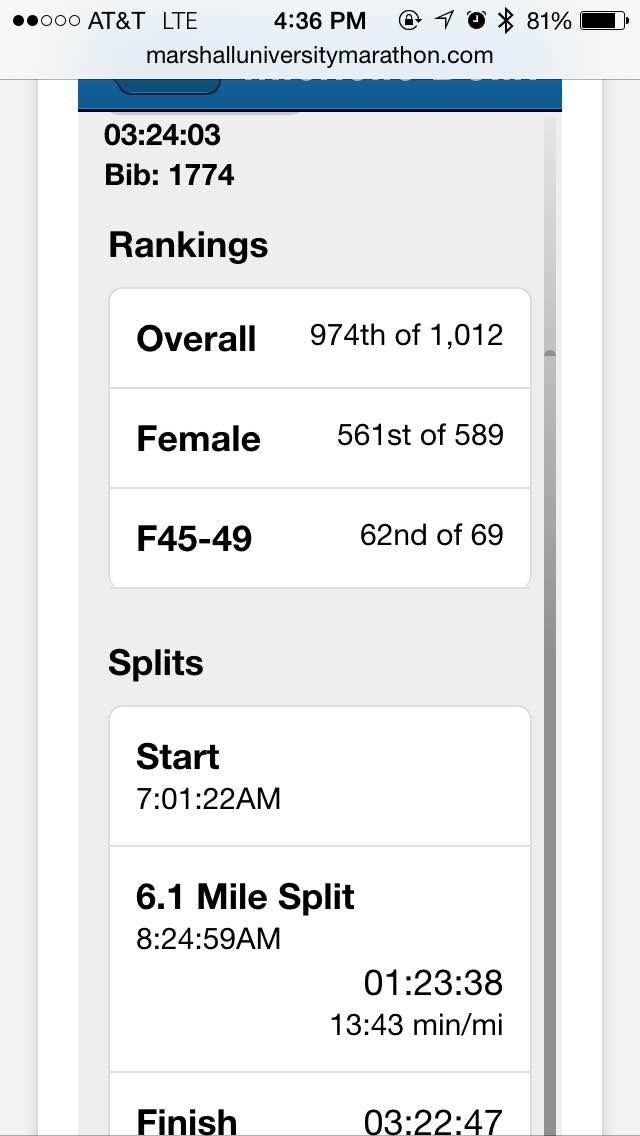 The map: As my daughter is graduating from Marshall and my husband owns a business in the area – I am very familiar with Huntington as a whole. For me (and for others I spoke with) the map was somewhat confusing. I was (in NO way) knocking the course itself. Just that (IMHO) an actual street map with the course highlighted would have been less confusing for me (not speaking for the others, just myself). I know that there were areas that were not drivable; again I am familiar with the area. That is why I thought an actual map would have been more helpful.