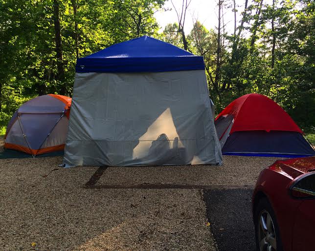 Before setting up the tents or canopy, we first put down tarps to act as an extra barrier in the event of wet ground/rain (thankful we did that). We used the tarps to map out placement. The canopy in the middle would be the common area, using a half-canopy rain fly to add privacy (blocked immediate view from the camp road). Going forward we will check weather statuses a little more closely. If there is rain, we will pull the tents into the canopy a little further (center of dome just past the awning to allow rain to spill down the back of the tent and not into an open rain fly – yeah, it happened).