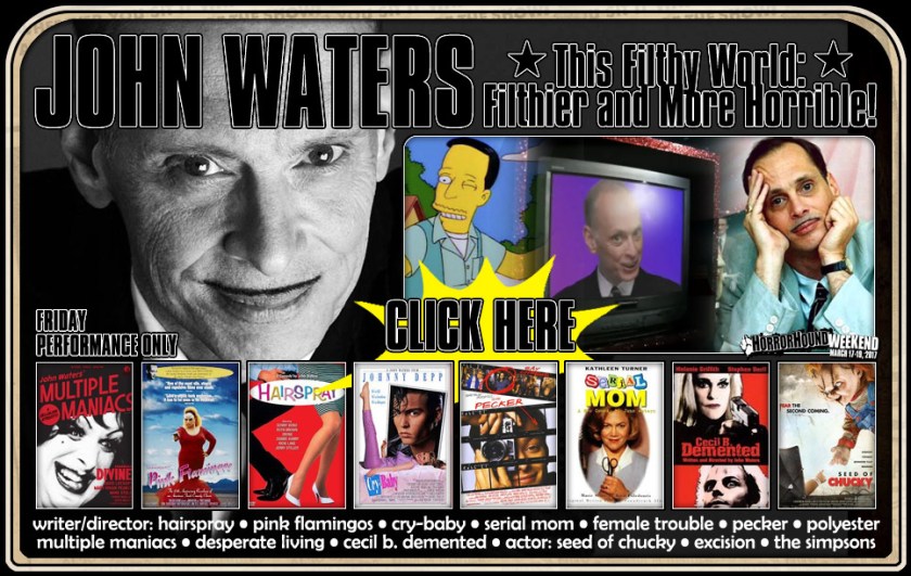 My friend Ben suggested we take in the HorrorHound Festival at the Sharonville Convention Center in Cincinnati so we could see the one and only John Waters. I was immediately ALL it! He was only there for the Friday night festivities, which was fine. The media guests were kind of thin on Friday night, the bigger names would appear Saturday and Sunday (Jeffrey Dean Morgan of the Negan fame among them). I had hoped to see Wilford Brimley but I was never able to be in the same room at the same time! We did catch glimpses of Cooper Andrews (LOVE him as Ezekiel’s sidekick Jerry on TWD) and Pollyanna McIntosh (new leader of the garbage dump gang on TWD).