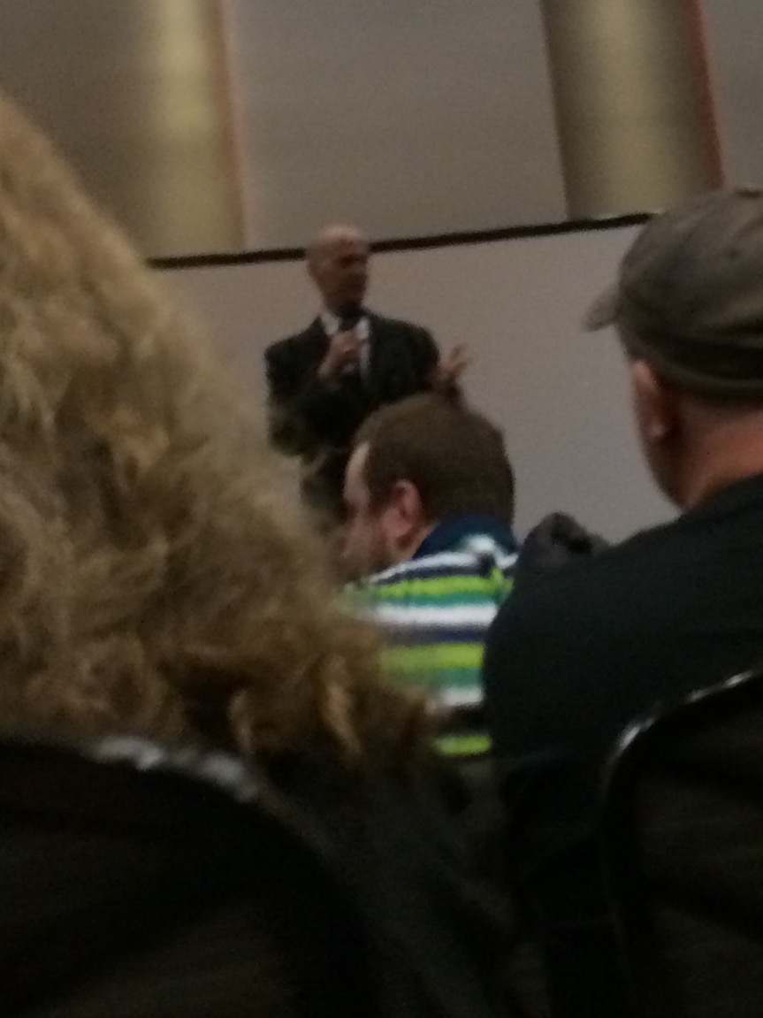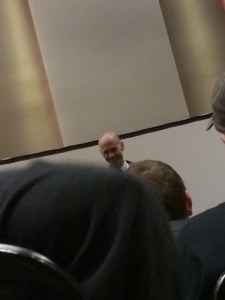 We were told that we were not allowed to take pictures. At all. Not even one. Nope. Nada. SOOOO… I put my phone on camera, held it against my notebook as he climbed the stage and then held my finger on the button, snapping away with all hope that I could get at least one “decent” picture. My results:
