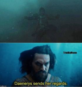 - Jamie is NOT allowed to end up a “good guy” nor is he allowed a dragon. He isn’t dead. Come on, that would be entirely too easy. And, if he did die this way I would applaud the show because, after all, I want Cersei to choke on a bug and die and non-epic death and if Jamie is alive there is the possibility that he will slay her before the gnat flies into her mouth. I see her being murdered at the hands of another and his blind love will throw him into a rage to kill the murderer. I hated how they had Bron pull him out of the water. COME ON! That armor – there is no possible way. I don’t care if he did puke. The show lost 3/4ths of a cool point for that one. Meh. Funniest meme on the internet had Jamie and Jon on the Westerosi Swim Team. HA