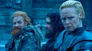 - Brienne of effing Tarth gets fitted for a pregnant armor because my favorite shipping couple is preggos with their first giant ginger baby. “Is the big lady coming.” Seriously, she needs to be looking through bridal magazines and choosing honeymoon destinations. Speaking of Brienne of Fucking Tarth – she was the subject of the most amazing exchange between Tormund and The Hound. And I know that this love-hope started with an impromptu action between the two actors, but holy hell – give us at least that show runners! Gingers, they have been kissed by the fire. He makes his intentions known – he wants to have babies with her “Great big monsters. They’d conquer the world.” YAS! And we would all be ok with watching a spinoff of nothing but Briemund Babies!!