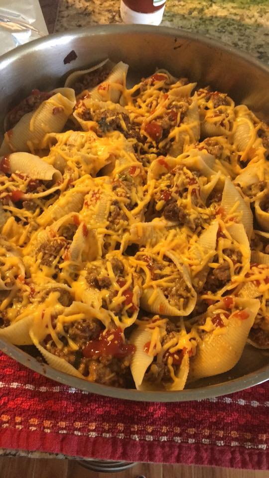 - Working one at a time, stuff each shell with a generous spoonful of cheeseburger filling and place in a large baking dish (I realized that my metal baking dish has vanished so I used an extra-large and deep all metal skillet). Repeat process until you have used all of the cheeseburger mixture.