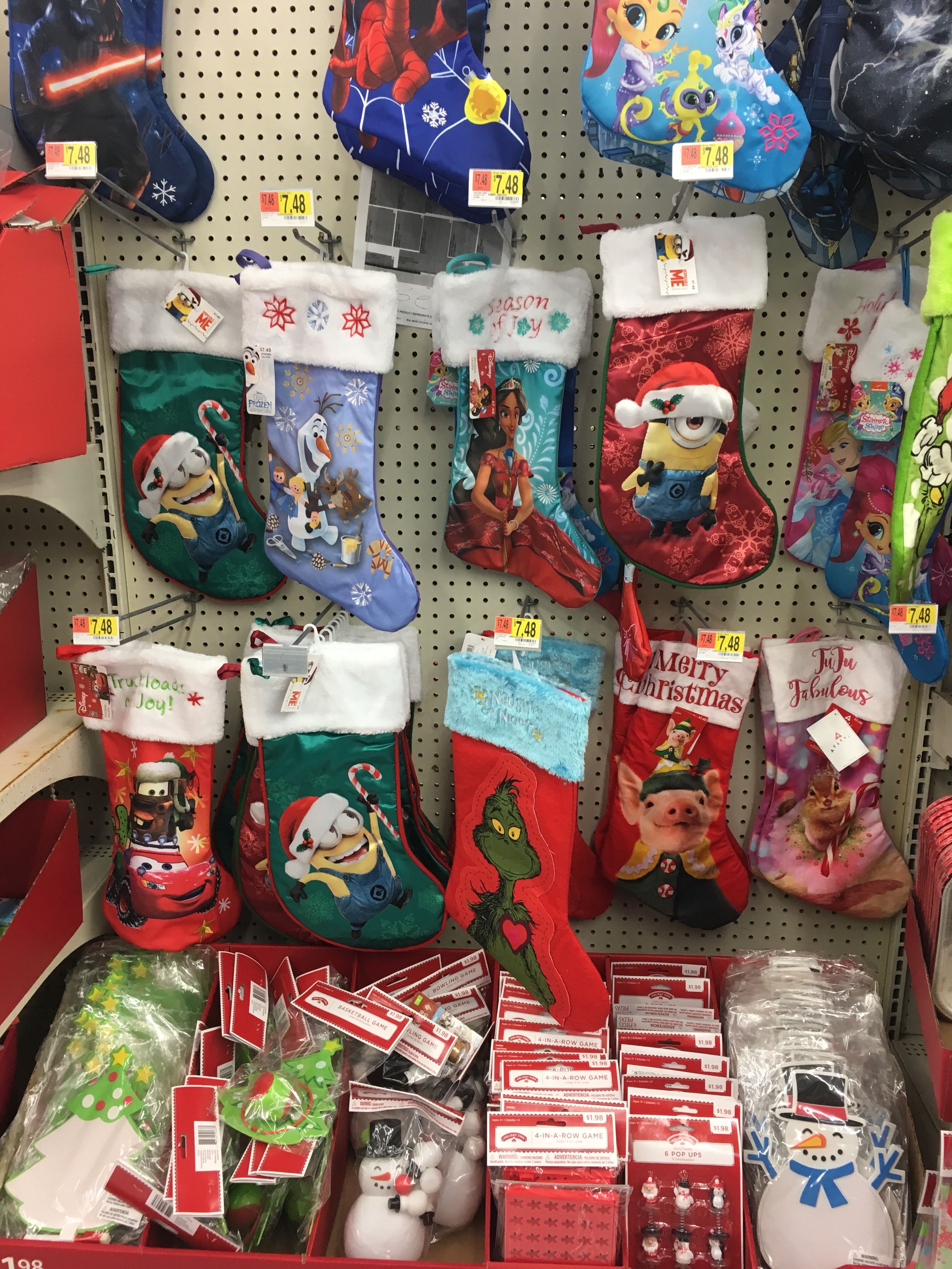 For those of you who are regular readers of this blog, you will know that I find myself very funny. I find that the older I get the less I care whether anyone is laughing with me. Picture a light bulb flipping on over my head! The thought struck me as such! I would send Pam a box of more than one Baby Jesus for Christmas! This would be epic! So, I thought I would easily throw together this whole wild crazy box of more than one Jesus within a couple of days because it was the onset of Christmastime and…you know, the reason for the season and all. Lesson number two: although it is Christ that the season is named for, the stores are only worried about one guy: Benjamin. My first stop (due to my location and limited sources) was The Walmart. Ten aisles of Christmas merch. You had stockings (with no Baby Jesus represented):