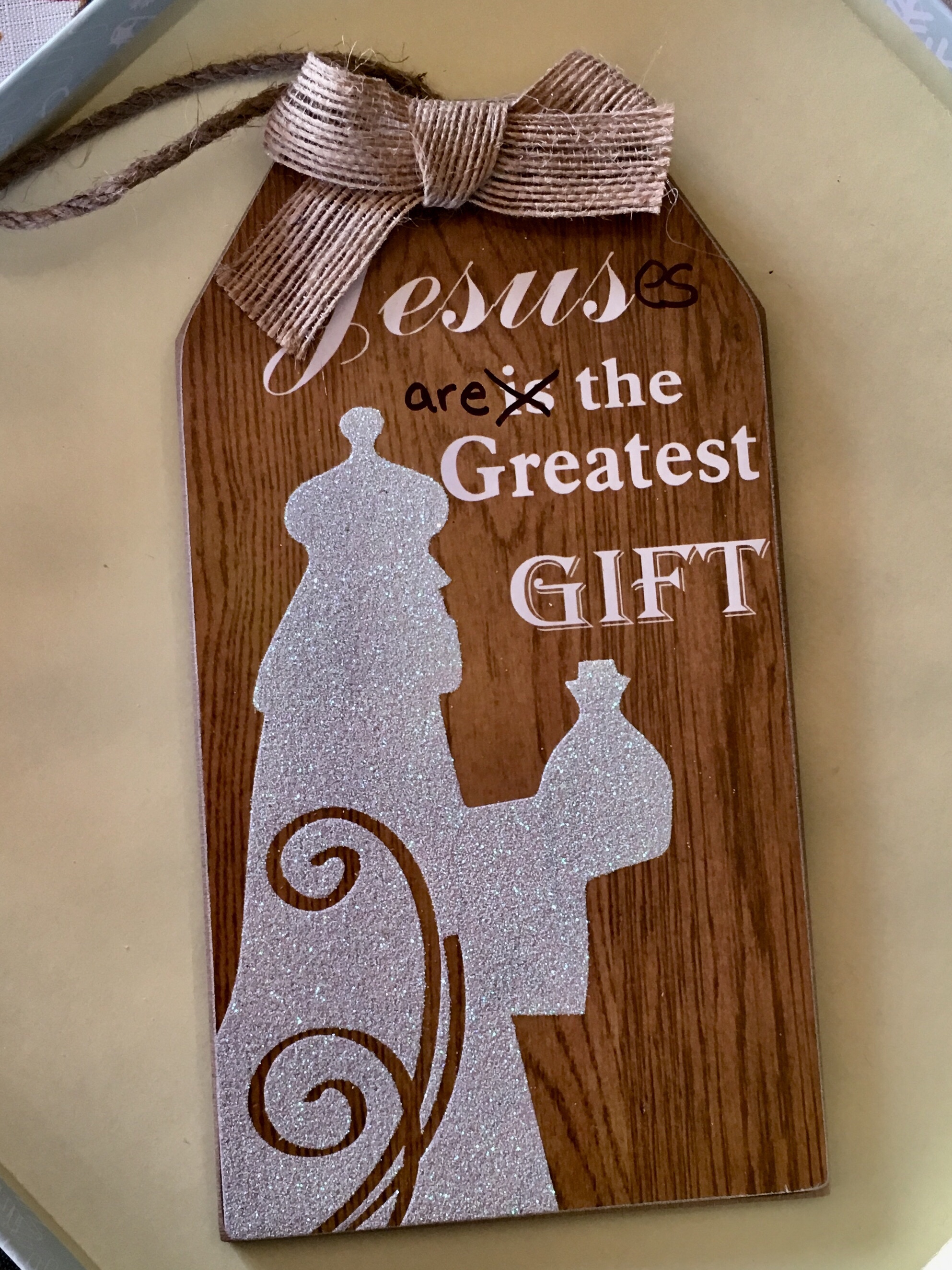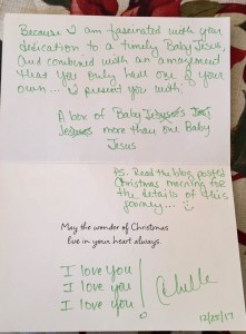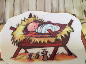 So, Pam has a long history of being upset over the untimely presentations of the Baby Jesus in the manger at Christmastime. In her opinion, he should not be there until ON Christmas Day because that is when he was born. She has been known to steal the Baby from his all-too-early manger in a friend’s house. Well, allow me to present Exhibit A, Pam’s own words….