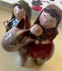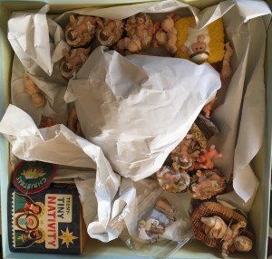 That is the card I sent with a box full of “more than one Jesus” to my amazing friend Pam. It pretty much sums up this adventure. First lesson of this adventure: What is the plural of Jesus. I know, I know, there was only “ONE” Jesus but for the purpose of ornamental Jesus – is it Jesi, Jesuses, Jessusses….? For the purpose of this blog we will say “more than one Baby Jesus”. For reference, I thought Jesi but a little research and one linguistic specialist email later, that is wrong. She told me that “Jesus” is the plural of “Jesus” – kinda like “deer”.