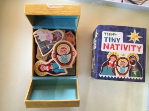 So, on to other stores because it was just a fluke, right? That this store (Walmart) had only three of the one type? Well, I went to Books A Million where there were scores of books on the Baby Jesus, his history, his story, etc. There were no Baby Jesus Funko Pops, there were no Baby Jesus action figures. I was disheartened. Then, in the impulse buy section of the store I found a Teeny Tiny Nativity. Seriously, it was called “Teeny Tiny Nativity”. In retrospect, this might be my favorite of all the Babies Jesus I would purchase. It is made of wood and had a little book about the birth of the King. Lesson #4 bookstores never fail me.