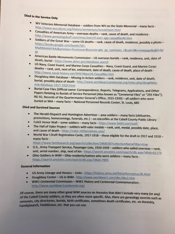 At the end of the evening, he passed out a reference sheet and I offer it here, in the event that others who research their West Virginia family line (and who have WV soldiers in that line) might find some use in it.