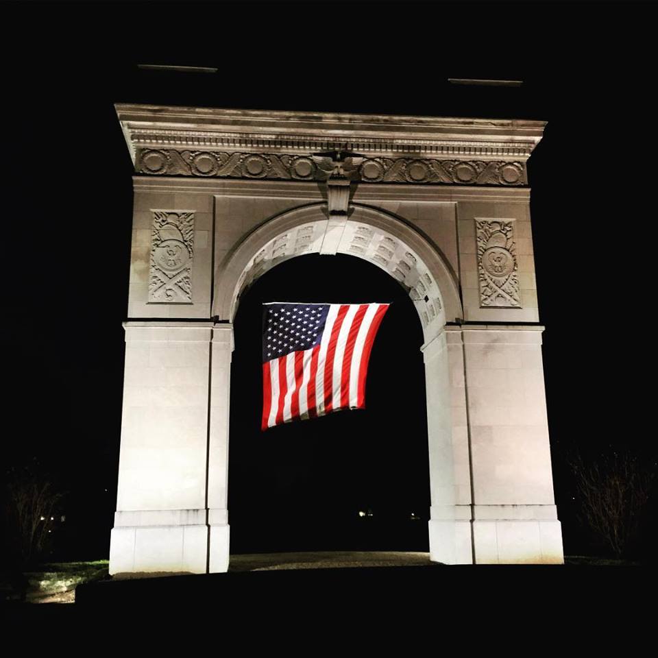 After the meeting adjourned, Renau and I drove to the Memorial Arch and we admired (best we could as it was nighttime and dark) the tree lined street . This area, just below Ritter Park, is a run course for most 5k races that start in Ritter Park. I had seen the arches numerous times but I had no idea of the story behind the trees next to it.