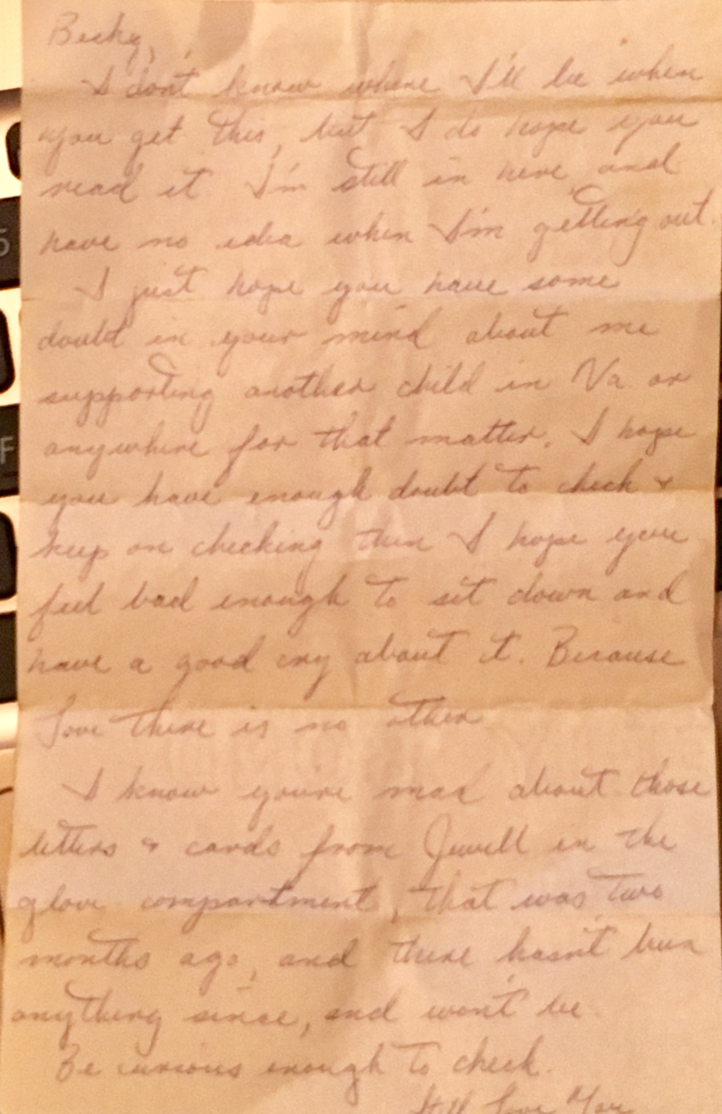 This letter says “I’m still in here.” I assume that means while he was jailed on the nonsupport charges (January 1970 per the above clippings). He says that he is not supporting “another child in Virginia”. Virginia is where Jewel lived at that time. One of the photos bound with these letters is of Jewel holding a baby, the photo date is 1969 and, if I might say, she looks angry (IMHO). No clue who the baby is as Jewel never had children. I cannot even confirm if the photo was in these particular letters, that is just where I found it. I would not be surprised if it was sent with a note stating “You have your baby and I have mine.” Reasons for my assumption of that, just look at the inscription on the back of the photo. Other reasons to follow further below. My father, in this letter, states he loves Ma and there is no other and that the letters she found were from a few months before (the cards/letters I have are from three months before so I am assuming those are the ones in question). I wonder if he was only saying this so she would drop the nonsupport charges against him and he could flee the state? Who knows.