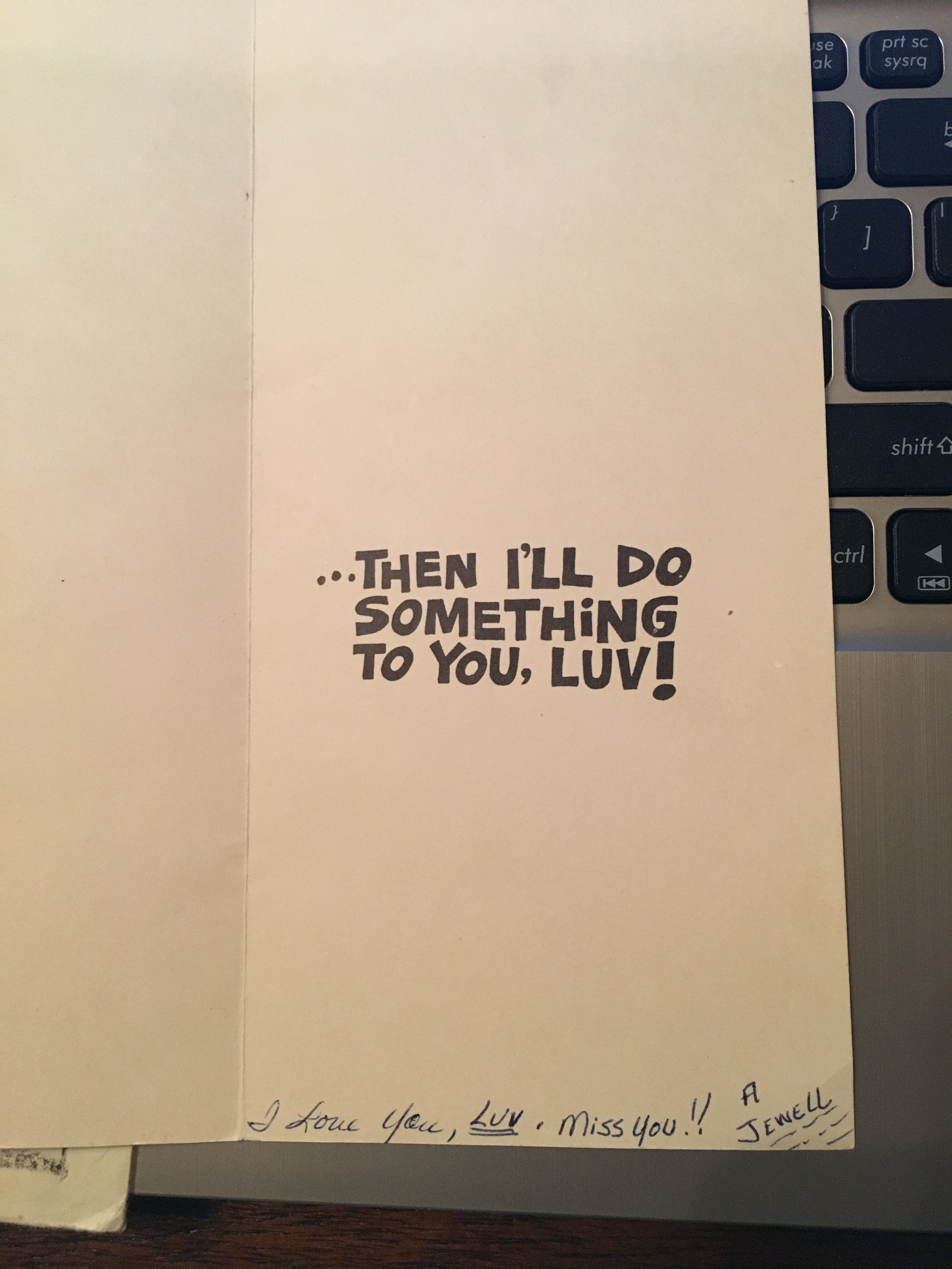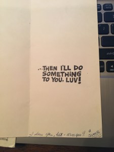 I have a cedar chest that was Ma’s. She passed away in 2010, creating an unfillable hole in my heart. Ever so often I will open the chest to see what it is I can find, what treasure there is there for me. It is overwhelming for me so there are still (8 years later) a number of things I have not fully looked at. Most times I find old pictures or school papers or Valentines that just make my heart soar. And sometimes, I unearth things that make that unfillable hole ache for my Ma. This blog includes some of those instances. It is part of my history, I want to write it down here and then be done with it (until those times when I am sullen and want to dwell on things that piss me off).