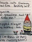 My first step has been to gather as much information on my birth parents as possible and then form a timeline from when they met until I was adopted by my Dad (Paul). That is roughly from my birth to kindergarten. I sat in the floor of my library last night, ransacked tubs of information scattered around the room, making it impossible to take a step. I fanned the paperwork out around me in a quazi-chronological order so I could gather my thoughts about the things I was looking at in a more coherent way. I have a large, lined journal with gnomes decorating the cover. I am using it to jot down notes and timelines for use in upcoming blogs. On the bottom of each page there is the same gnome, looking as if he is judging me. I have taken to calling him Gene (short for genealogy).