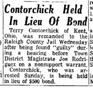 1970-01-15 Raleigh Register clipping: Terry Contorchick of Kent, OH was found guilty during a hearing before Magistrate Joe Rodriguez on a nonsupport warrant and remanded in lieu of $500 bond. Was arrested on Sunday. (01/11/1970). Below is a clipping from page 11 of the Beckley Post Herald 16-Jan-1970. This was found on newspapers.com