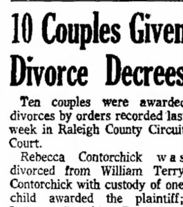 1972-02-18 Register Herald: Rebecca Contorchick was divorced from William Terry Contorchick with custody of one child awarded the plaintiff. Below is a clipping from page 6 of the Beckley Post-Herald 22-Feb-1972. I found this on newspapers.com