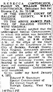 1972-01-06 Beckley Post Herald: Divorce Case C.A. No. 72168, notice to William Terry Contorchick, hearing to be held Feb 14, 1972 by word of Edward D Stansberry, Special Commissioner. Notice to defendant Civil Action No 72-7158, you must answer by Feb 8, 1972. Failure to do so may result in action taken against you for the relief demanded in the complaint. C. Harold Hanks, Clerk of Court. (another notice published 1972-01-13, same paper). Below is a clipping from page 17 of Beckley Post-Herald 6-Jan-1972. I found this on newspapers.com. There were two sections, one below the other, first section was divorce, second was a civil matter between the two. I am trying to find out: 1-Attempting to obtain a copy of the divorce records filed in Raleigh County, WV