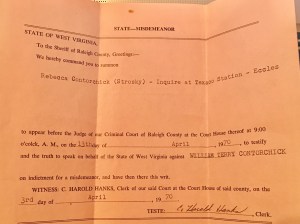 1970-04-13 Copy of summons for Rebecca Contorchick to appear on behalf of the state of WV in the hearing against William T Contorchick. Below are front/back photos of a summons found in a cedar chest of family documents.