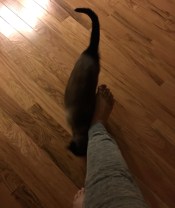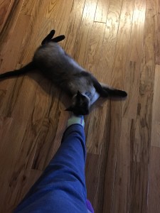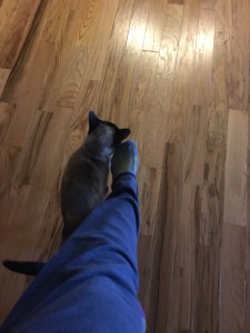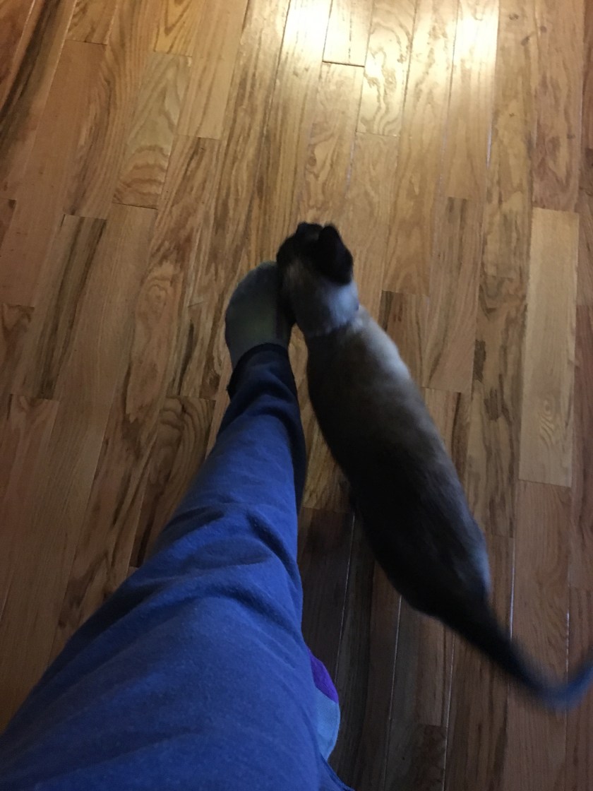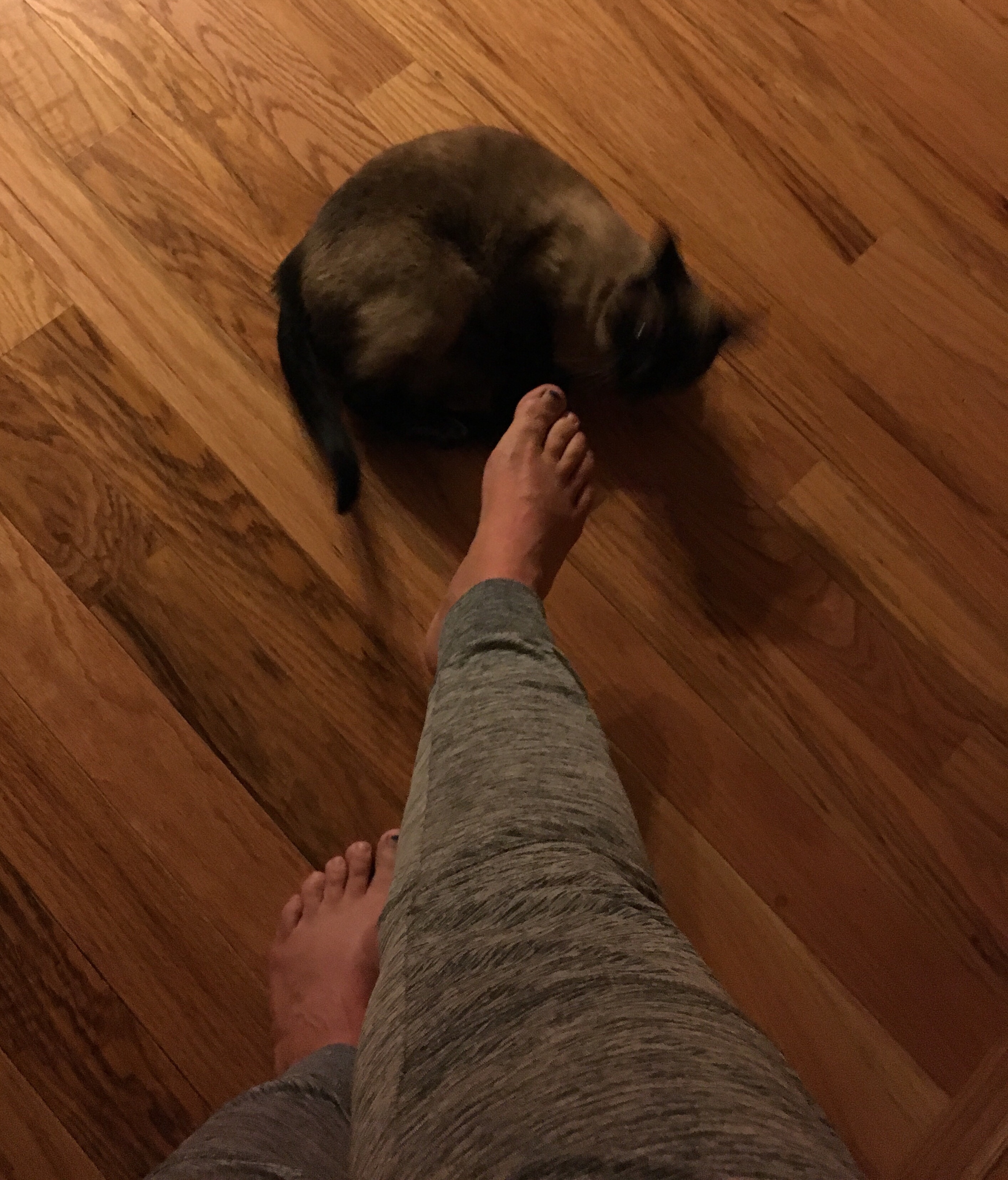 I have been doing leg lifts every day, multiple times per day, for varying lengths of time on my right side. When I make coffee, when I go to the fridge, when I am walking to the back of the house. Because my Siamese is a freak and will not let people pet her with their hand, most of us tend to hold our leg out and let her “self pet”. I know, I know, we are enablers! That is not what this post is about though… Since my first surgery April 2016, Phoebe suddenly would not let me pet her, would not lay in my lap, etc – all the day I came home from surgery – I thought that it was a phase, it was not. Something about my chemistry changed and this was a result. But truly, I NEVER use my left leg to pet her. Ever. It was like a lightning bolt smacked me upside my head (weird reference but I’m rolling with it).