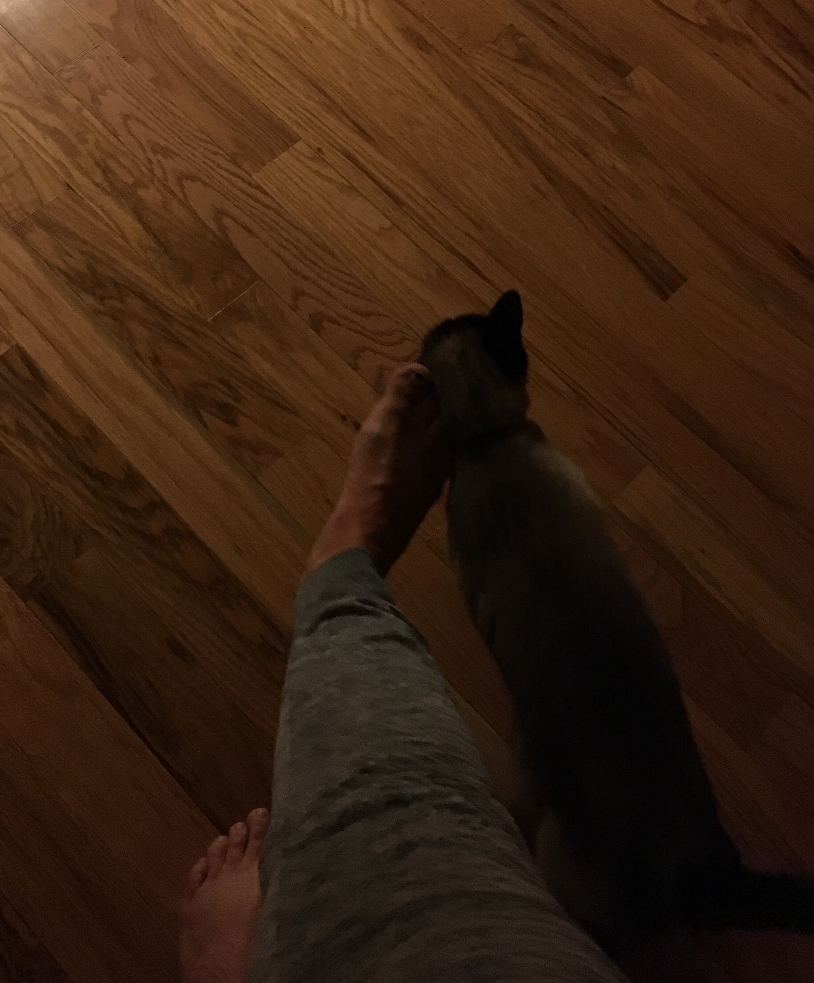 Now that I know the problem, I am trying to do the left leg self pet thing. And I will chuckle about this at some point (when my pants go back to fitting right). Right now I feel like an idiot. But the cat loves me.