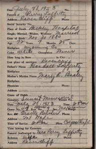 Frank Hoder, DOB: 20 Sep 1883, DOD: 9 Feb 1953, Place of Death: en route to Beckley Hospital, Beckley, WV