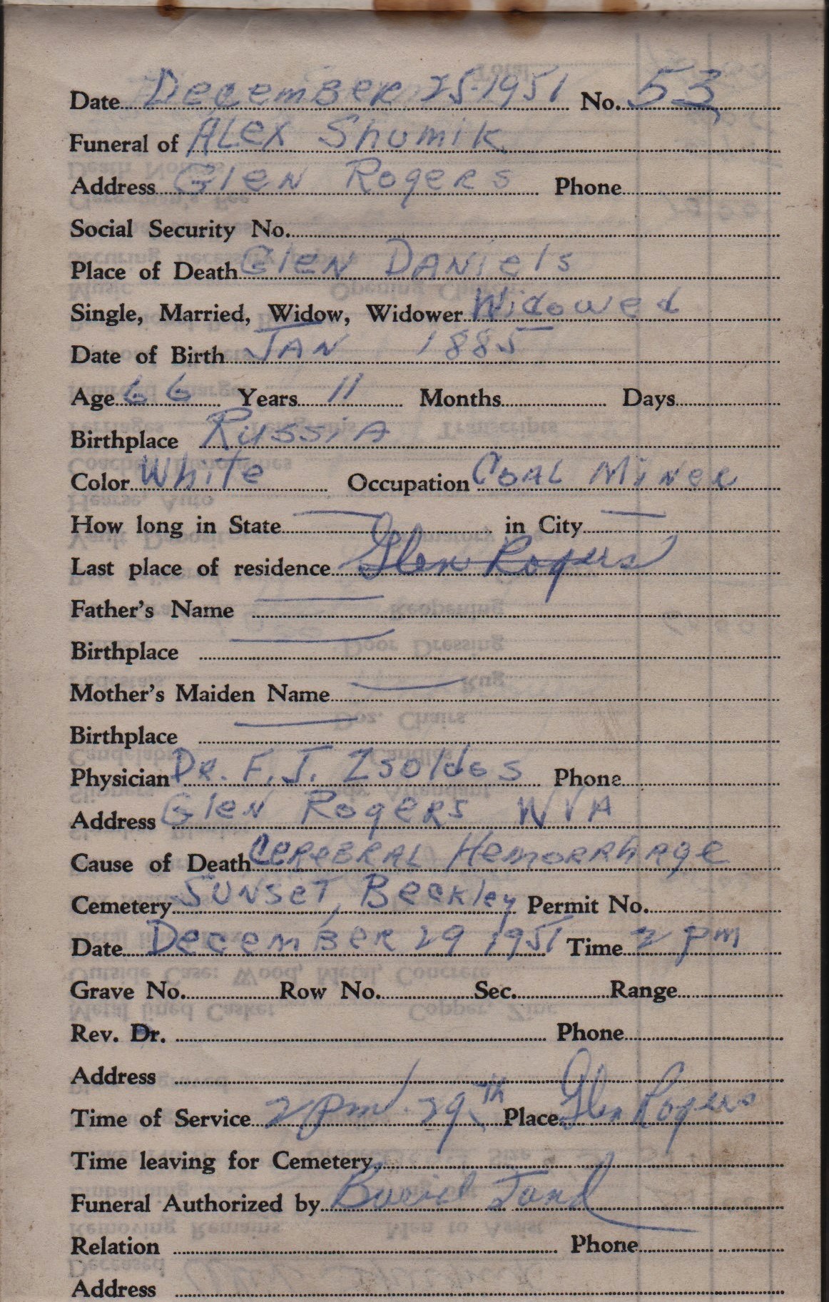 Alex Shumik, DOB: Jan 1885 / DOD: 25 Dec 1951 / Place of Death: Glen Rogers, WV