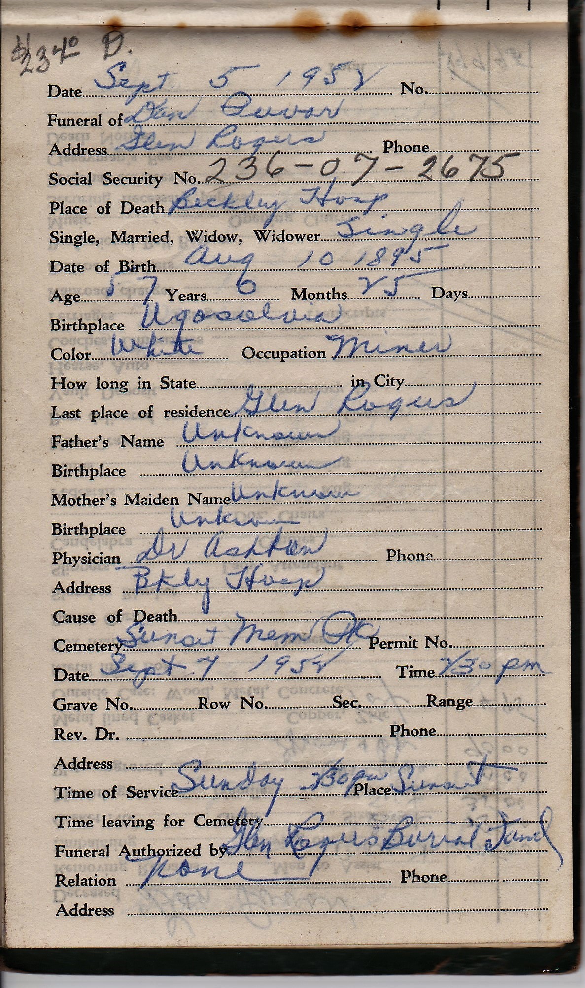 Dan Puvar, DOB: 10 Aug 1895, DOD: 5 Sep 1952 / Place of Death: Beckley Hospital, Beckley, WV