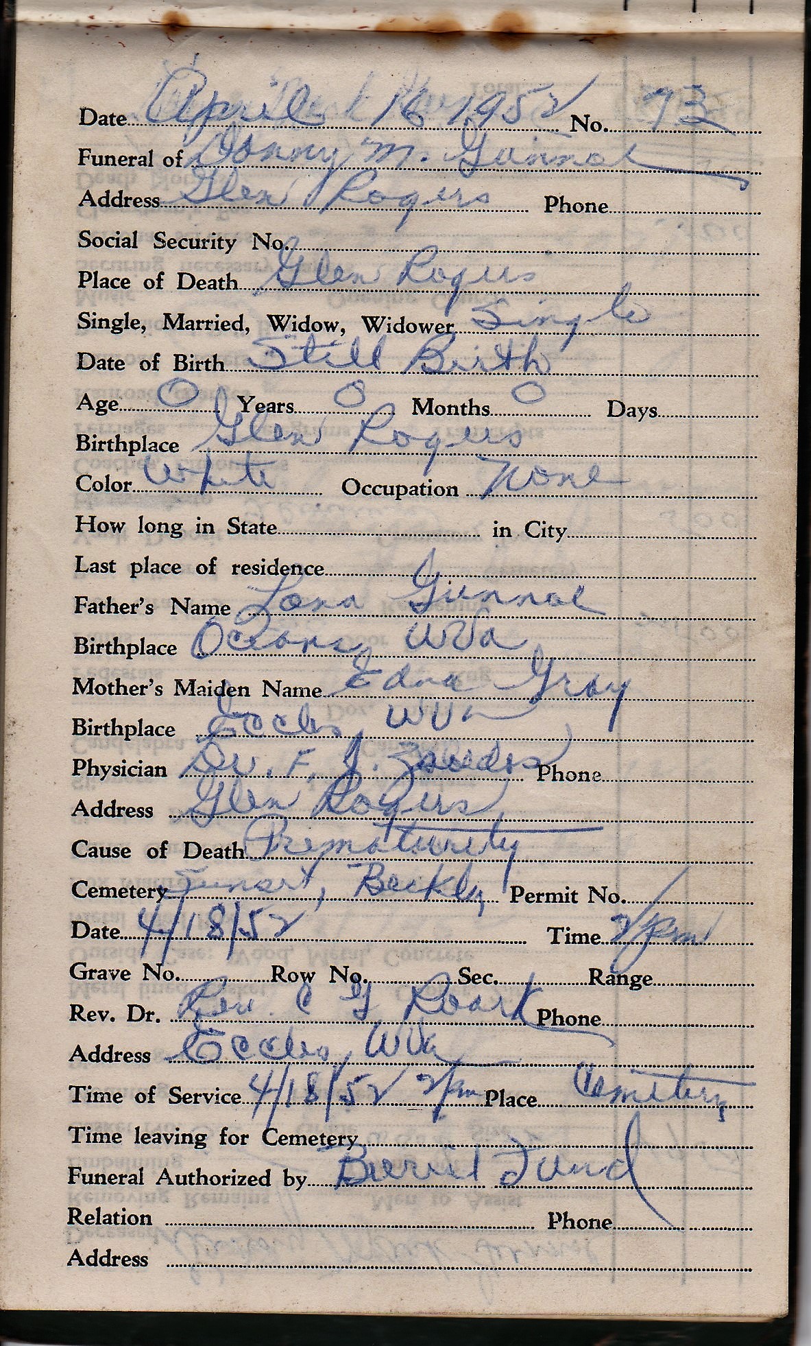 Danny Mark Gunnoe, DOB: Still Birth / DOD: 16 Apr 1952 / Place of Death: Glen Rogers WV