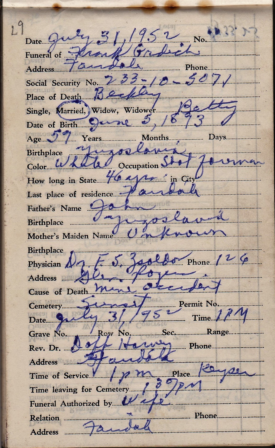 Frank Grdich (yep, spelled that way), DOB: 5 Jun 1873, DOD: 31 Jul 1952 / Place of Death: Beckley, WV