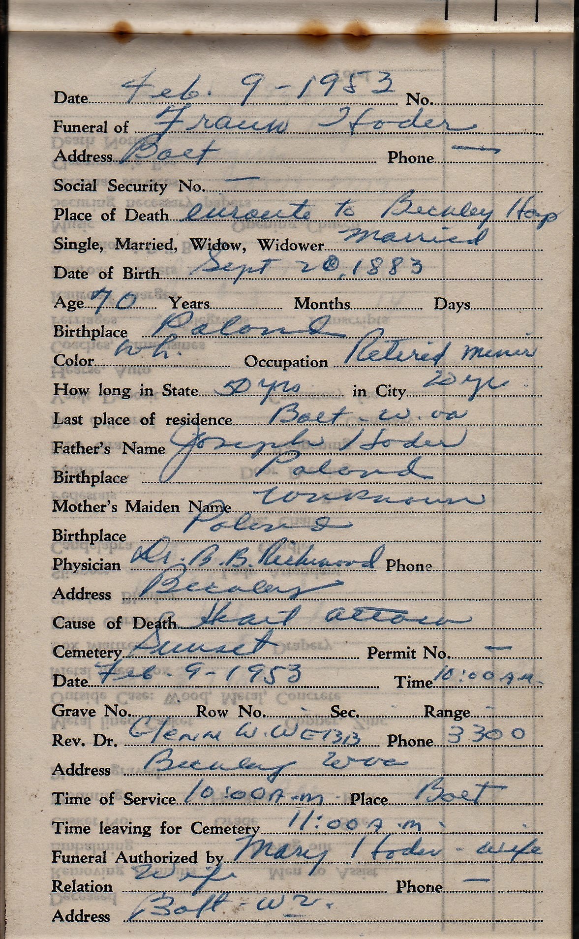 Frank Hoder, DOB: 20 Sep 1883, DOD: 9 Feb 1953, Place of Death: en route to Beckley Hospital, Beckley, WV