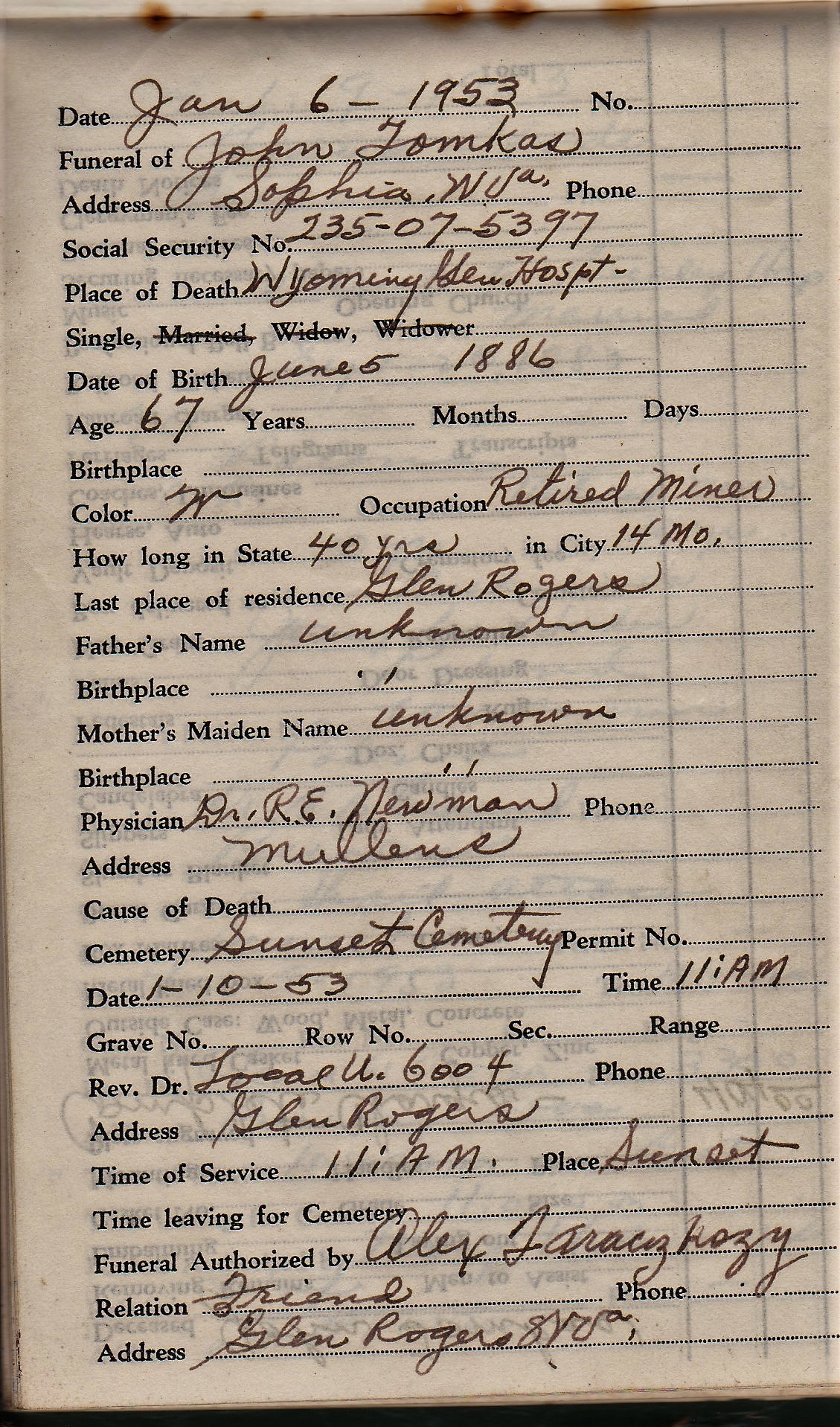 John Tomkas, DOB: 5 Jun 1886, DOD: 6 Jan 1953, Place of Death: Wyoming General Hospital, WV