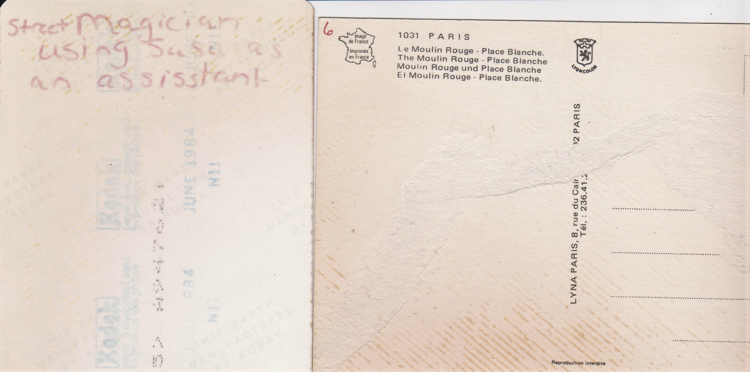 After the pizza, we decided to take in the Moulin Rouge area because it would be beautiful, all lit up. My camera did not cooperate (unknown to me at the time). Luckily, I grabbed a post card to commemorate. While in the area, we enjoyed a street magician’s act. I love that he is in a suit.