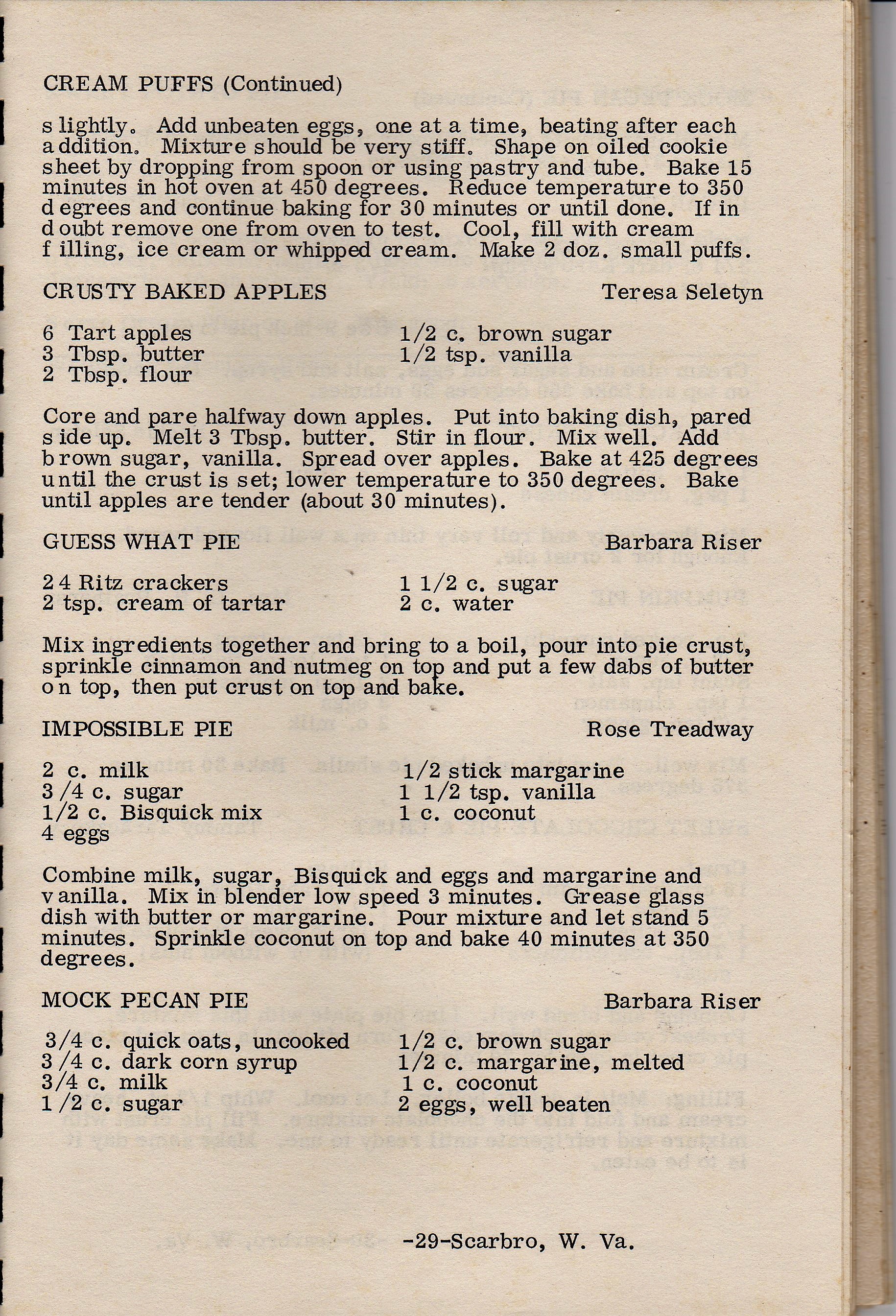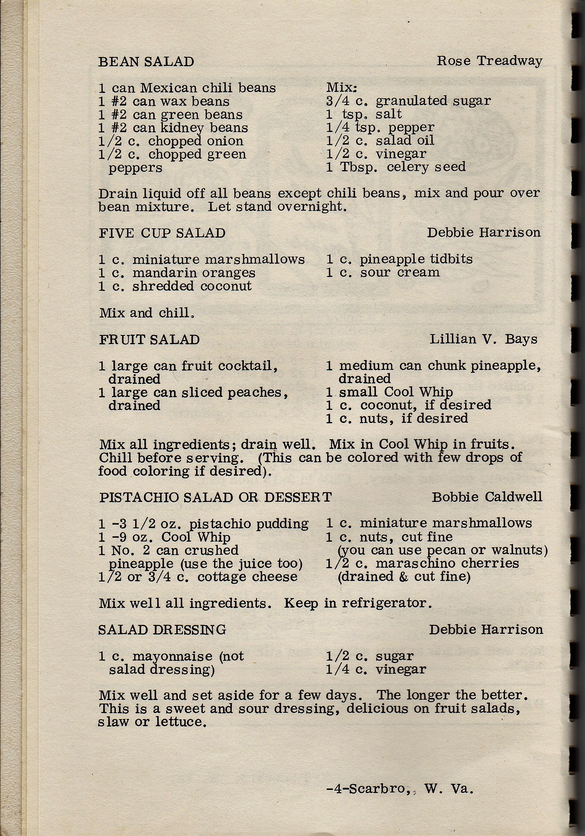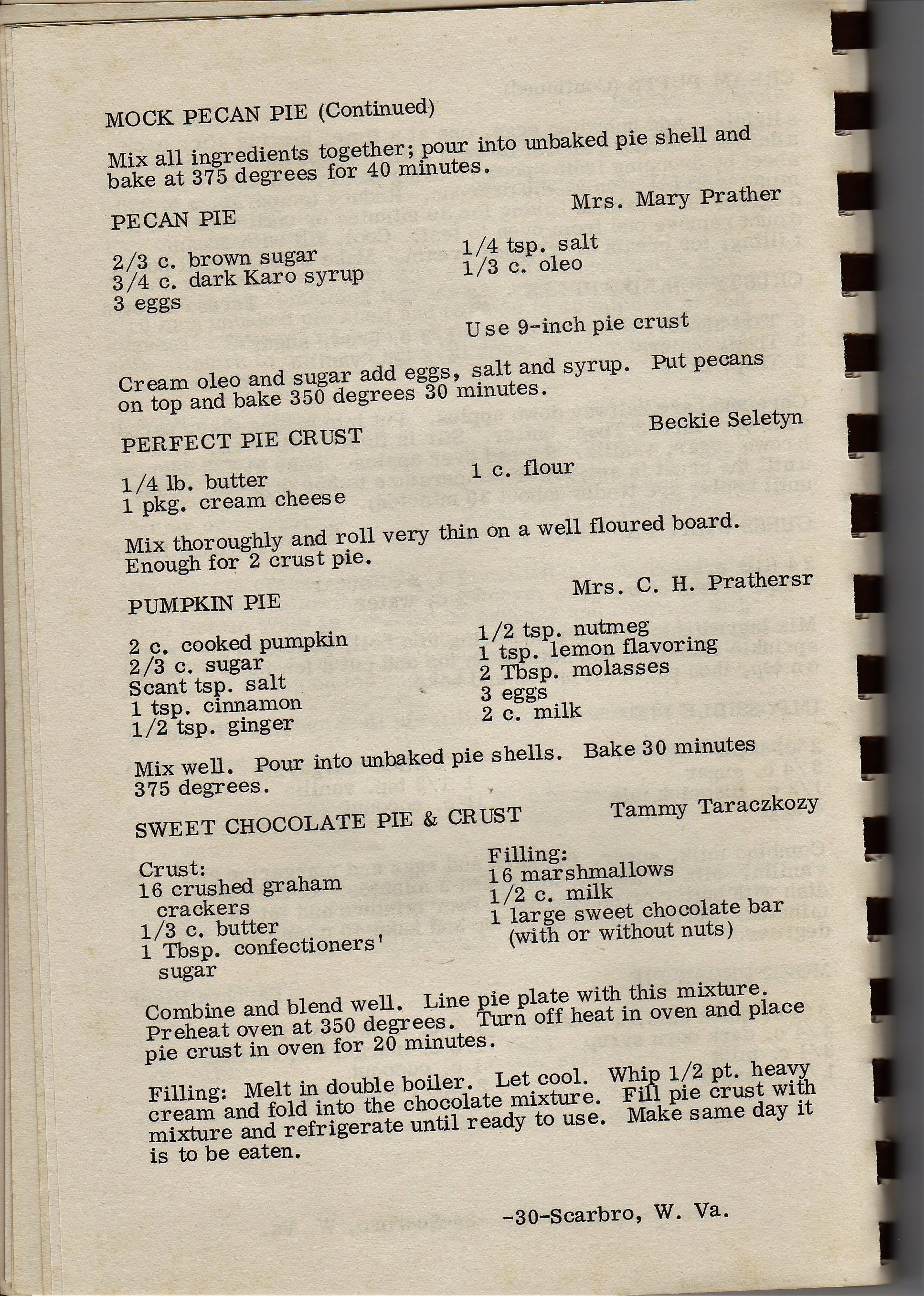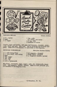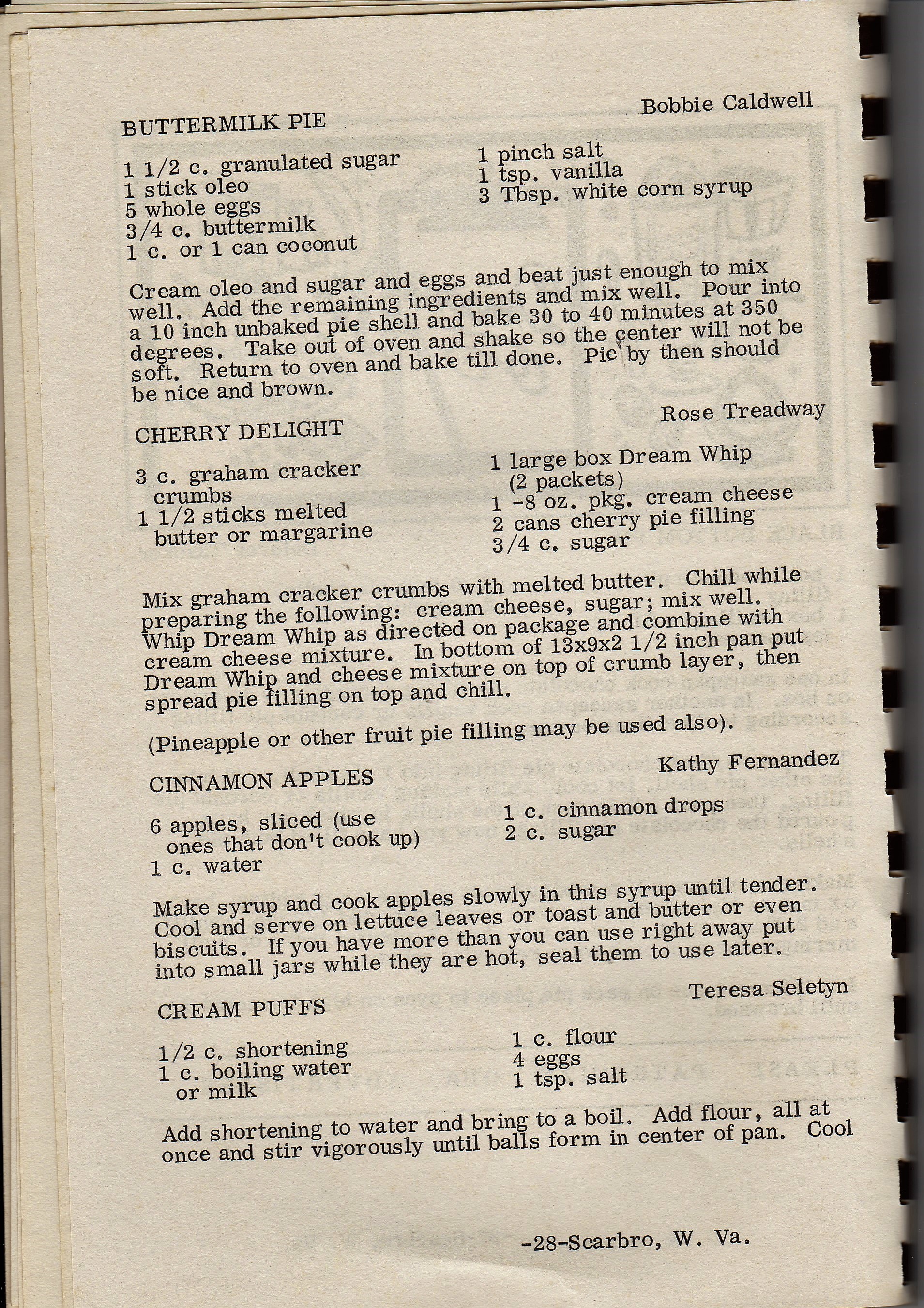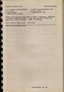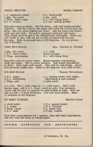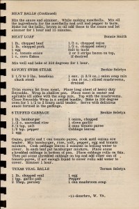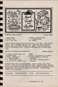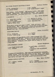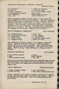 This cookbook has to be from when I was in (maybe) 5th/6th grade (1980-81). I received first communion in fifth grade and around that time I devoted all of my attention to the Catholic Church. I still attended youth group in Carlisle on occasion because it was at the end of my street and Mom sometimes liked to go (she converted to Catholicism I think in my 6th grade year). Both of my Grandmothers, my Mom and a wide range of family and friends have recipes in this cookbook. It was put together for the youth group of Carlisle Church of God, my Nana’s church.
