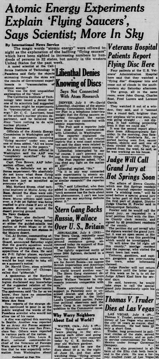 In online newspapers, I was able to find on 6 July 1947 (Sun), the Albuquerque Journal printed articles on their Page 1 regarding disc sightings and the possible cause (Atomic Energy Experiments).