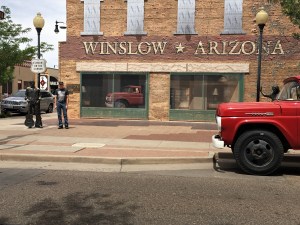 With Bobby being a die-hard Eagles fan, it only made sense that one of our stops on this road trip would be Winslow, Arizona.  The irony in this situation is that Bobby is a Chevy-man.   As the lyrics go: “Well, I’m a standin on a corner in Winslow, Arizona. Such a fine sight to see.  It’s a girl, my lord, in a flatbed Ford slowing down to take a look at me.”
