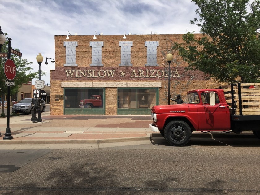 With Bobby being a die-hard Eagles fan, it only made sense that one of our stops on this road trip would be Winslow, Arizona.  The irony in this situation is that Bobby is a Chevy-man.   As the lyrics go: “Well, I’m a standin on a corner in Winslow, Arizona. Such a fine sight to see.  It’s a girl, my lord, in a flatbed Ford slowing down to take a look at me.”
