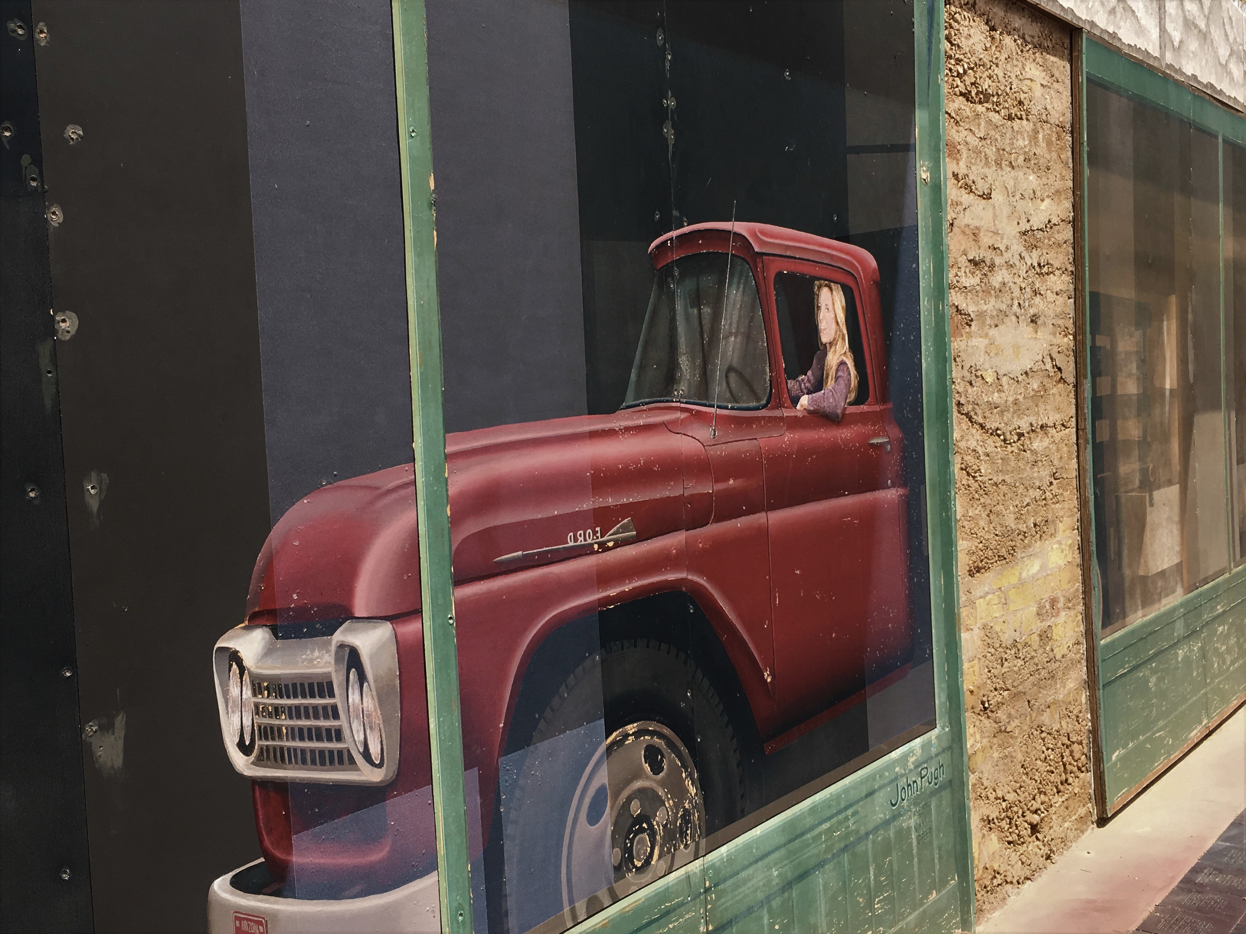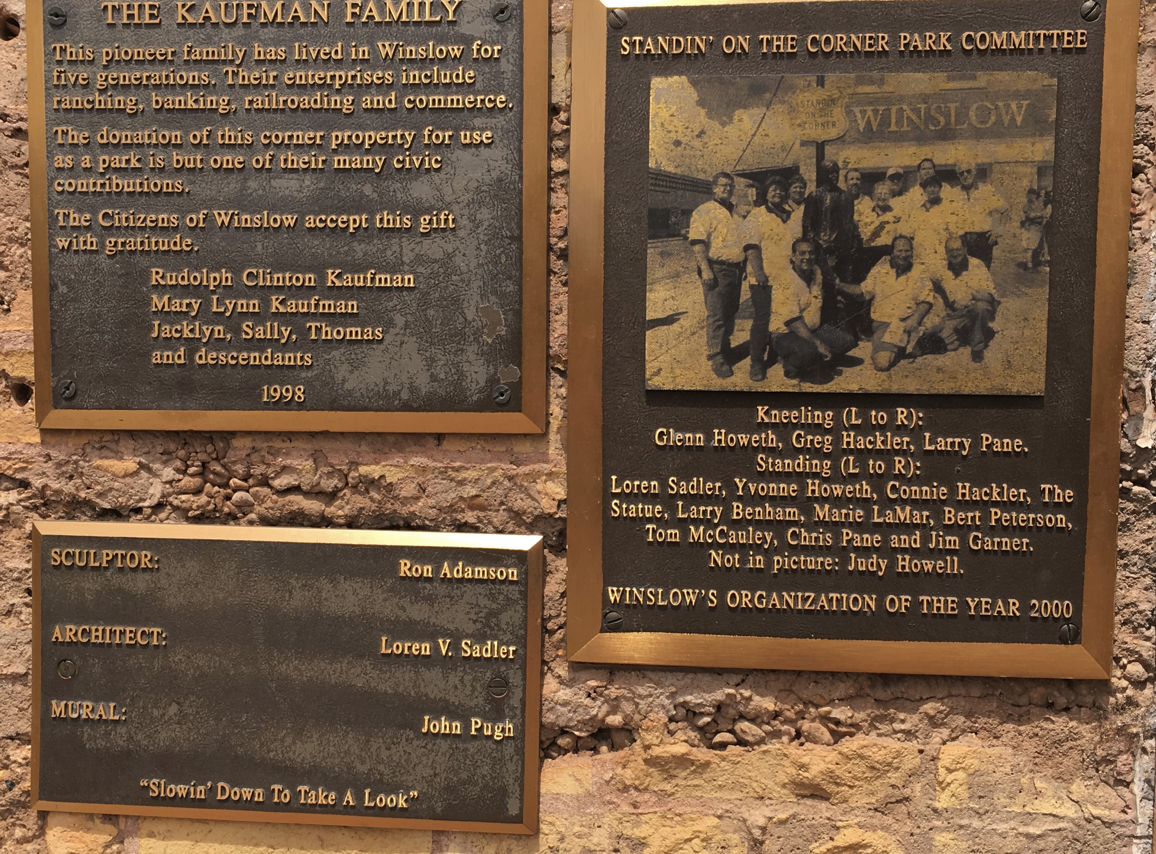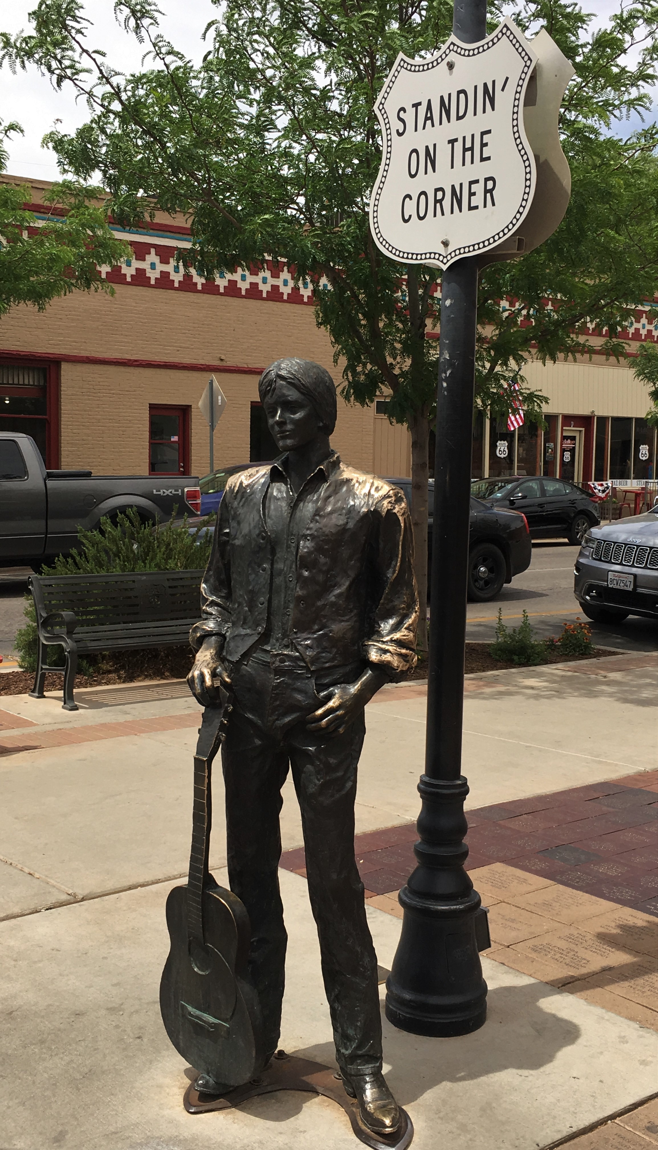 The official name for this site is: Standin’ On A Corner Park.  The park was opened in 1999 to commemorate the song Take It Easy, sung by the Eagles and co-written by Jackson Browne and Glenn Frey.  The mural in the background was created by the artist John Pugh.  This type of artwork is called trompe-l’œil.  In this style of artwork, the artist creates a visual illusion, tricking your eye into believing a painted detail is a 3D object.  (Being picky, my issue with the mural is that if it was truly a reflection in the window, the woman would not be visible – that is my nitpick, just ignore the critic.)