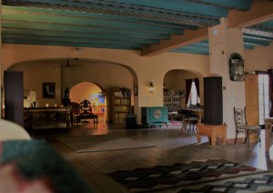 With this story in mind, she designed Mission Revival buildings with adobe walls, complete with niches for saints, roofs of red terra cotta, and windows with wooden shutters and iron rejas (grilles). Floors were flagstone, and exposed ceiling beams were covered with branches to simulate indigenous adobe construction. There were period maids’ costumes and dinner china, vigas (protruding wooden beams) beneath the gables, wrought-iron railings on the stairways, clay tiles on the chimneys, sand-blasted planks on the doors, and a wishing well in the garden. Best of all in this elaborate history-within-a-history confection, Colter faked an archeological site–the supposed ruins of an old fort that had stood on the site before the don built his hacienda.