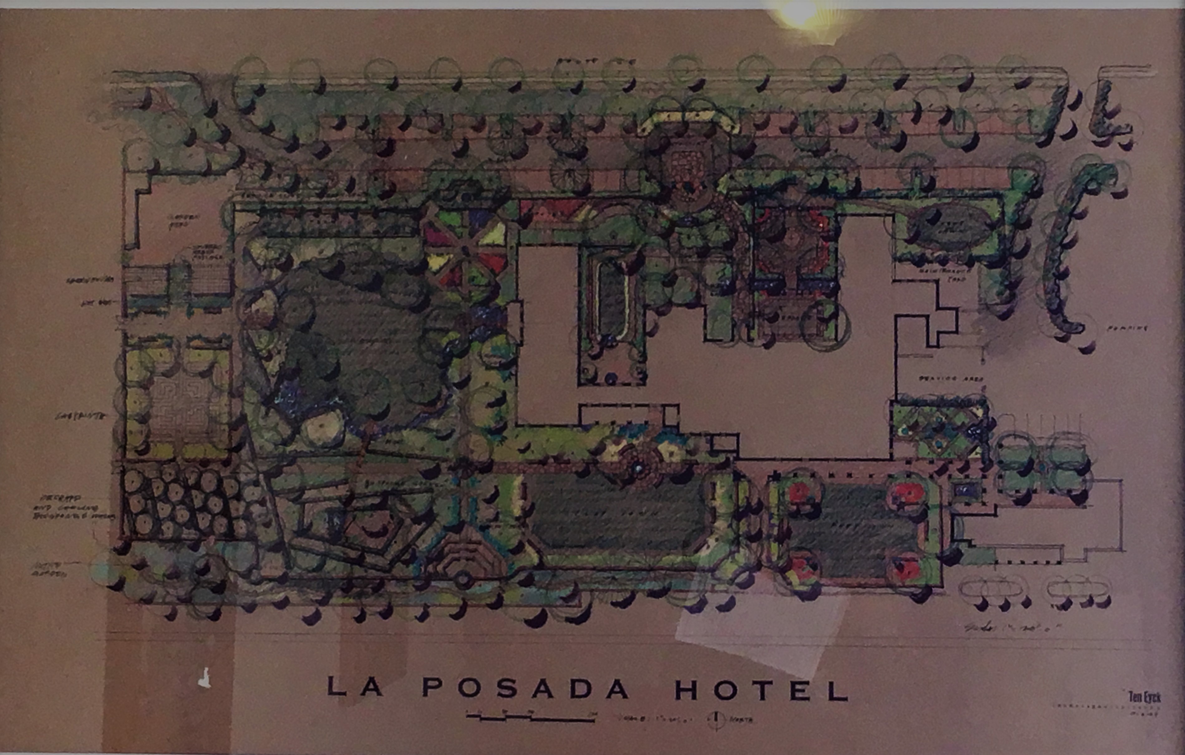 Built in 1929, the 11-acre grounds, hotel, and train station that make up La Posada Historic District are, in their own right, historic. But an additional layer of history is here, one invented in the imagination of the architect. In order to design the La Posada complex, architect Mary Colter made up a century and a half of history for the site. She imagined La Posada as a Spanish ranchoof the early 1800s. Here lived a wealthy Spanish don. When the don and his family fell on hard times, the hacienda was renovated into a hotel with furnishings and grounds intact. In such an inaccessible location, Colter reasoned, materials would have been local, and the labor native. The complex would have been changed and added onto through generations.
