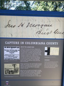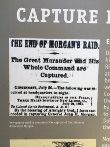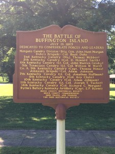 Also according to the website: “Buffington Island Battlefield is the site of the only significant Civil War battle in Ohio. On July 19, 1863, a Union force of 3,000 cavalry, artillery, infantry, and navy personnel routed a column of 1,800 Confederate cavalry and artillery commanded by Brigadier General John Hunt Morgan. From July 13 – 26, 1863, Morgan led a group of more than 2,000 men across Southern Ohio. His mission: to distract and divert as many Union troops as possible from the action in Middle Tennessee and East Tennessee. Union forces under the command of Major General Ambrose Burnside gave chase. It was at Buffington Island on the morning of July 19 that two Union cavalry columns led by brigadier generals Henry Judah and Edward Hobson, and two Union gunboats under Lieutenant Commander LeRoy Fitch, cornered Morgan and his men as the Confederates were trying to cross the Ohio River. The two-hour battle resulted in 6 killed and 20 wounded on the Union side and 57 killed, 63 wounded, and 71 captured on the Confederate side. Throughout the day following the battle, Union militia and regular troops captured 570 Confederates who had fled the field. The Union troops dealt a heavy blow to Morgan’s men and resources, but, despite losing nearly half his men and all of his artillery and supplies, Morgan escaped. Major Daniel McCook, patriarch of the fighting McCook family, was mortally wounded in the battle. Morgan’s remaining raiders turned north, exhausted and desperate to find another place to cross. On July 26, near Salineville, in Columbiana County, Union cavalry under the command of Major W.B. Way defeated Morgan’s cavalrymen in a running fight, and later that day, Union Major G.W. Rue’s cavalry surrounded Morgan’s Raiders and succeeded in capturing General Morgan and the remnants of his command near West Point. Morgan’s capture marked the end of Morgan’s Raid.”