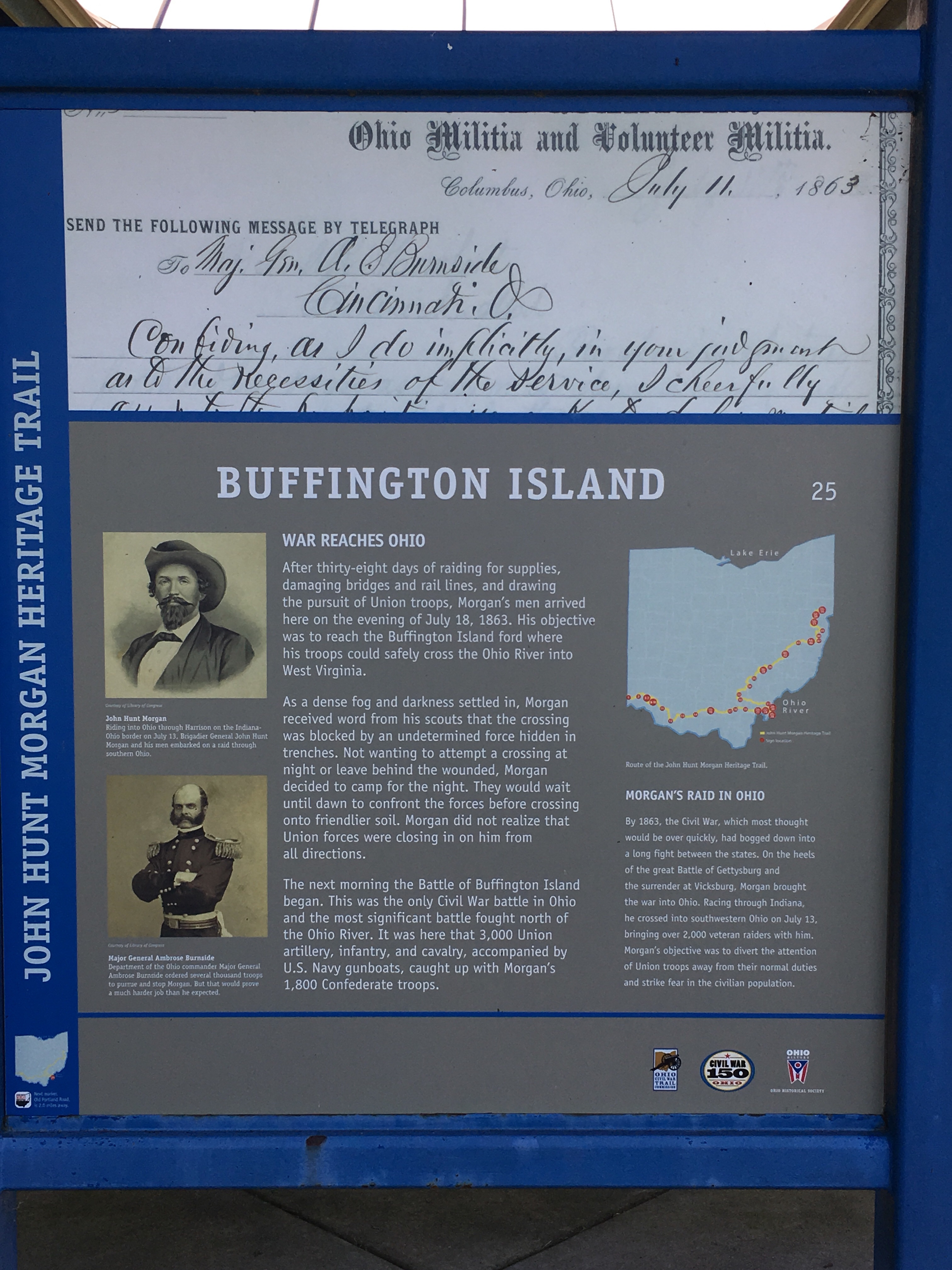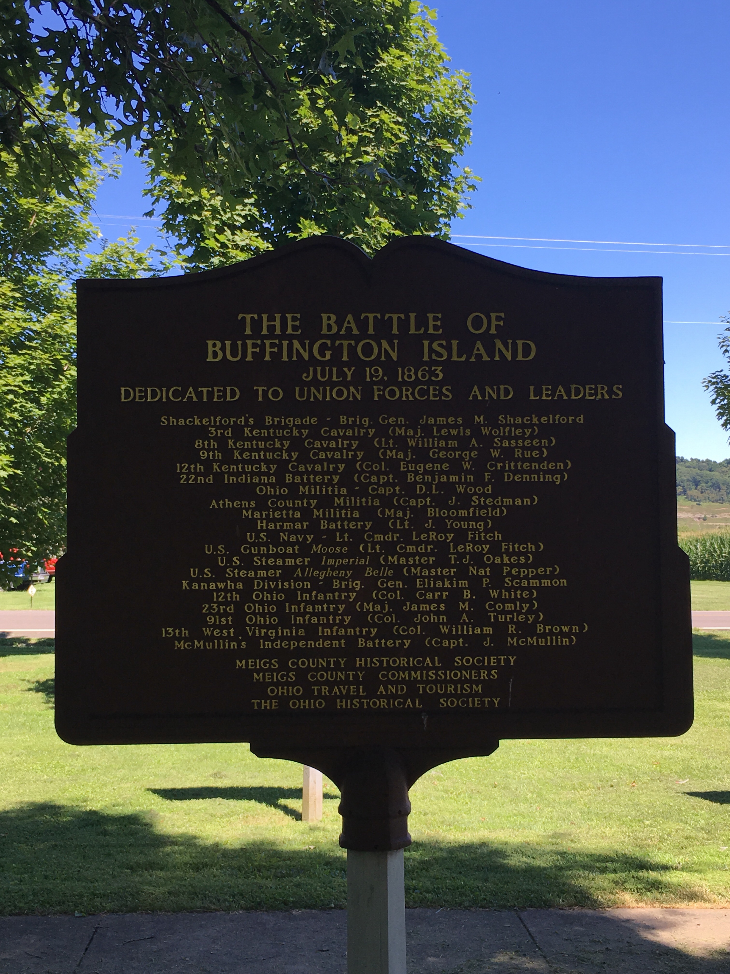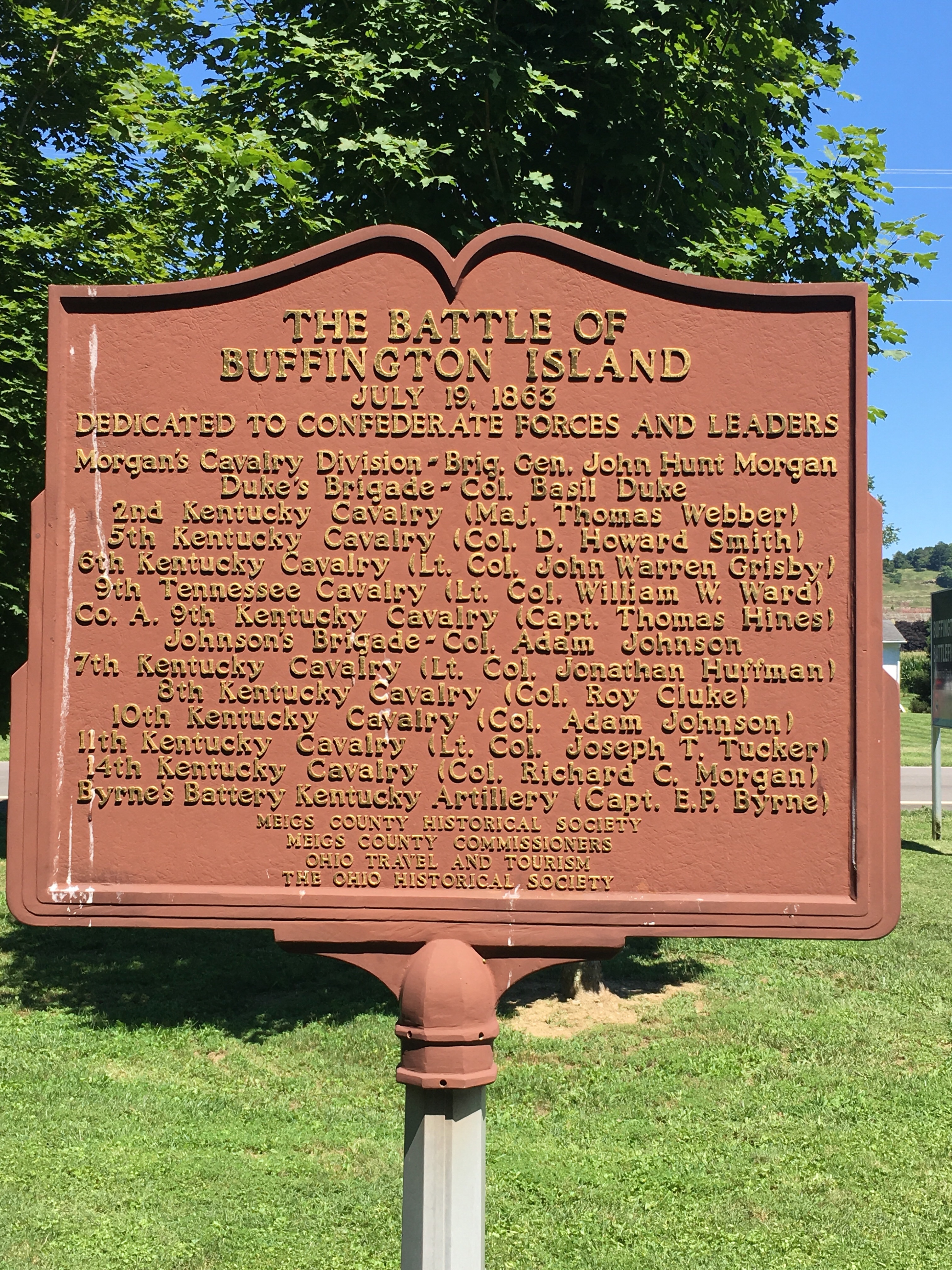 Also according to the website: “Buffington Island Battlefield is the site of the only significant Civil War battle in Ohio. On July 19, 1863, a Union force of 3,000 cavalry, artillery, infantry, and navy personnel routed a column of 1,800 Confederate cavalry and artillery commanded by Brigadier General John Hunt Morgan. From July 13 – 26, 1863, Morgan led a group of more than 2,000 men across Southern Ohio. His mission: to distract and divert as many Union troops as possible from the action in Middle Tennessee and East Tennessee. Union forces under the command of Major General Ambrose Burnside gave chase. It was at Buffington Island on the morning of July 19 that two Union cavalry columns led by brigadier generals Henry Judah and Edward Hobson, and two Union gunboats under Lieutenant Commander LeRoy Fitch, cornered Morgan and his men as the Confederates were trying to cross the Ohio River. The two-hour battle resulted in 6 killed and 20 wounded on the Union side and 57 killed, 63 wounded, and 71 captured on the Confederate side. Throughout the day following the battle, Union militia and regular troops captured 570 Confederates who had fled the field. The Union troops dealt a heavy blow to Morgan’s men and resources, but, despite losing nearly half his men and all of his artillery and supplies, Morgan escaped. Major Daniel McCook, patriarch of the fighting McCook family, was mortally wounded in the battle. Morgan’s remaining raiders turned north, exhausted and desperate to find another place to cross. On July 26, near Salineville, in Columbiana County, Union cavalry under the command of Major W.B. Way defeated Morgan’s cavalrymen in a running fight, and later that day, Union Major G.W. Rue’s cavalry surrounded Morgan’s Raiders and succeeded in capturing General Morgan and the remnants of his command near West Point. Morgan’s capture marked the end of Morgan’s Raid.”
