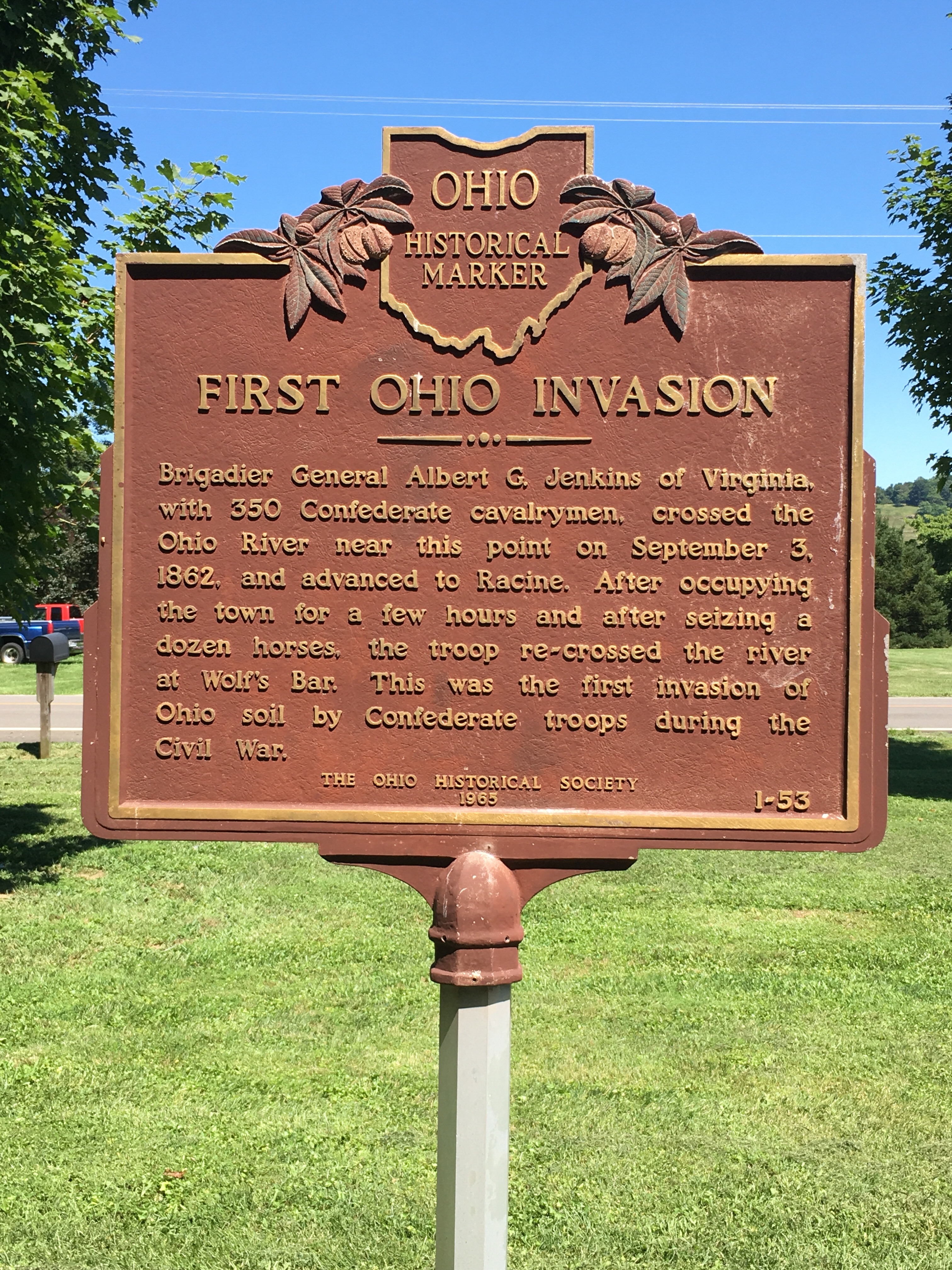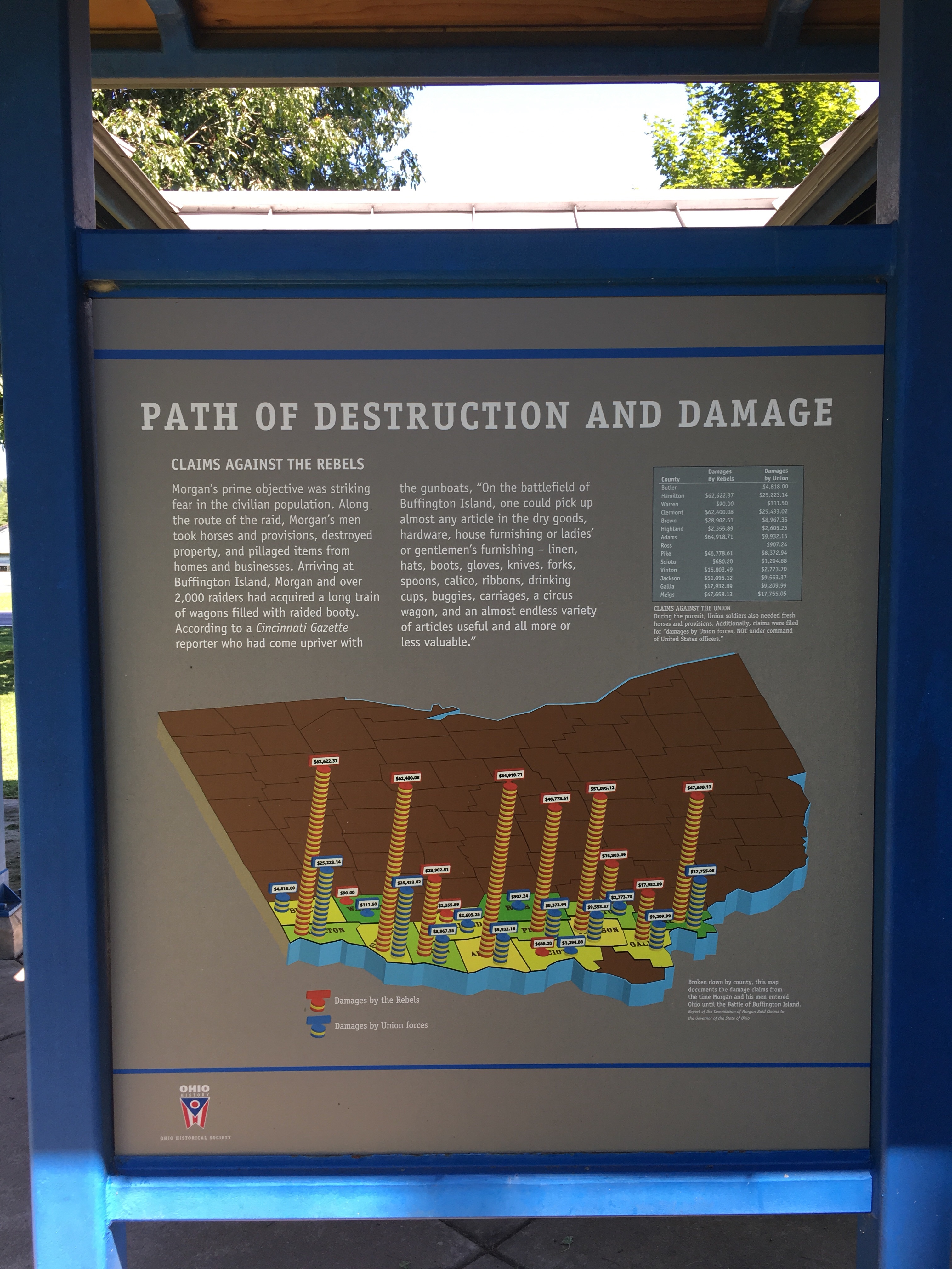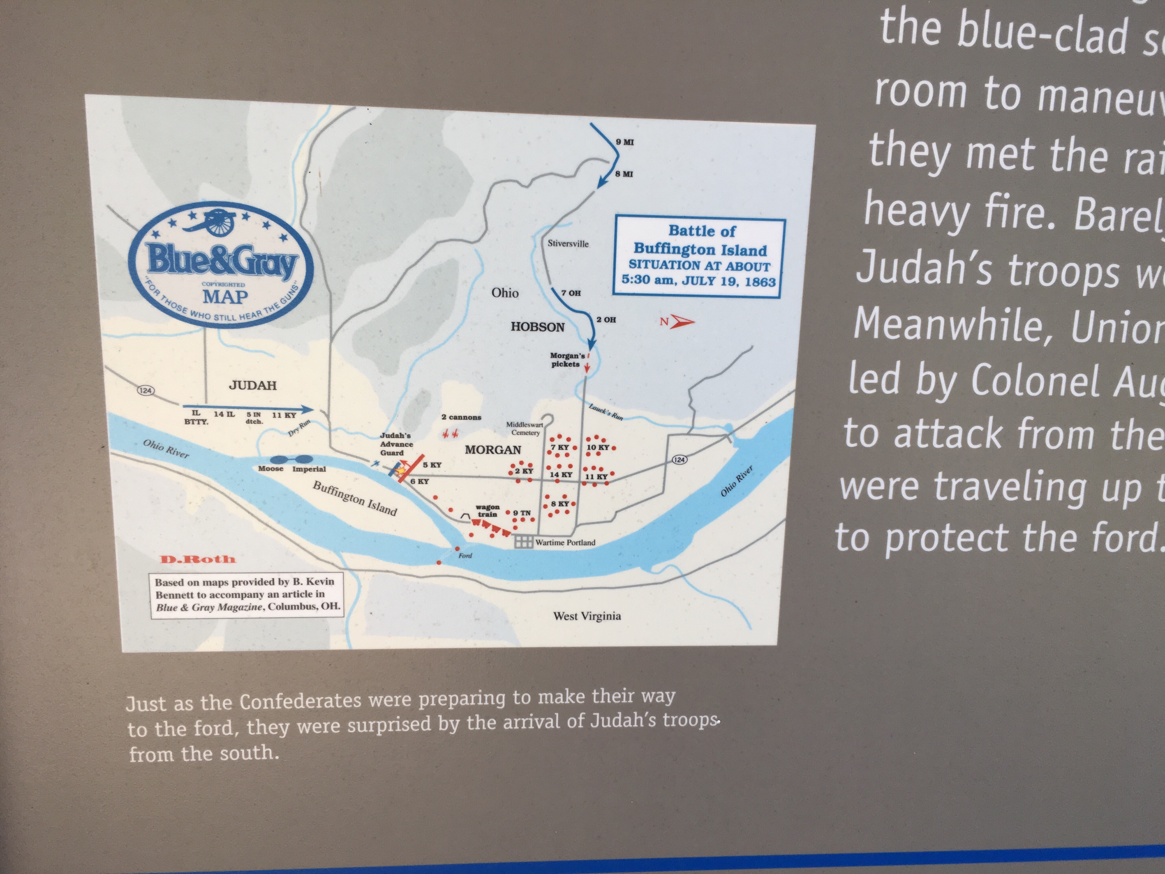 Also according to the website: “Buffington Island Battlefield is the site of the only significant Civil War battle in Ohio. On July 19, 1863, a Union force of 3,000 cavalry, artillery, infantry, and navy personnel routed a column of 1,800 Confederate cavalry and artillery commanded by Brigadier General John Hunt Morgan. From July 13 – 26, 1863, Morgan led a group of more than 2,000 men across Southern Ohio. His mission: to distract and divert as many Union troops as possible from the action in Middle Tennessee and East Tennessee. Union forces under the command of Major General Ambrose Burnside gave chase. It was at Buffington Island on the morning of July 19 that two Union cavalry columns led by brigadier generals Henry Judah and Edward Hobson, and two Union gunboats under Lieutenant Commander LeRoy Fitch, cornered Morgan and his men as the Confederates were trying to cross the Ohio River. The two-hour battle resulted in 6 killed and 20 wounded on the Union side and 57 killed, 63 wounded, and 71 captured on the Confederate side. Throughout the day following the battle, Union militia and regular troops captured 570 Confederates who had fled the field. The Union troops dealt a heavy blow to Morgan’s men and resources, but, despite losing nearly half his men and all of his artillery and supplies, Morgan escaped. Major Daniel McCook, patriarch of the fighting McCook family, was mortally wounded in the battle. Morgan’s remaining raiders turned north, exhausted and desperate to find another place to cross. On July 26, near Salineville, in Columbiana County, Union cavalry under the command of Major W.B. Way defeated Morgan’s cavalrymen in a running fight, and later that day, Union Major G.W. Rue’s cavalry surrounded Morgan’s Raiders and succeeded in capturing General Morgan and the remnants of his command near West Point. Morgan’s capture marked the end of Morgan’s Raid.”