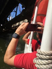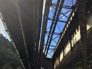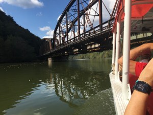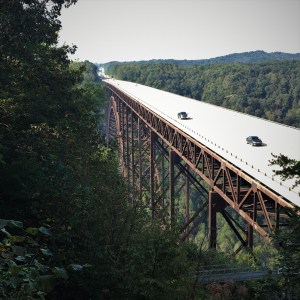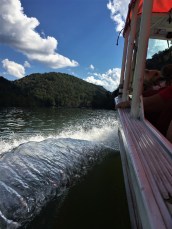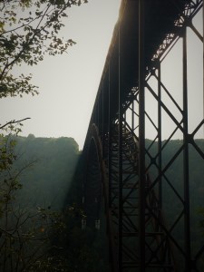 We made it to Hawks Nest and Judy purchased tickets for the tram to the bottom of the gorge where we would board a sight seeing boat. Once we reached the bottom we realized that the tickets were still in the tram! After a comedy of errors, and tickets in hand, we grabbed our seats on the boat. Although it was an entertaining ride, full of gorge splendor, we both would have preferred the boat to not smell like piss. Ugh! Once we rounded the bend and the NRG Bridge stood before us, it made the olfactory faux pas more bearable.