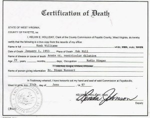 Before we made it to the Hilltop Cemetery, there were a few stops at the Library, Jones Mansion and I showed Judy the location where it was realized Hank Williams Sr. was dead. As the story (very loosely) goes: Hank had hired a college freshman, Charles Car, to drive him on a short tour from West Virginia through Ohio. The young man would drive Hank’s 1952 Cadillac while Hank would sleep/rest along the way. They left Montgomery, Alabama at 11:30AM on December 30, 1952. They first made the local DJ circuit, speaking on radio shows, before heading out. A snow storm cut their travel short and they checked into a hotel. As the story goes, a few women found their way into Hank’s room and when asked where they were from, one said “Heaven” and Hank reportedly replied that she was the reason he was going to hell. The next morning they checked out of the hotel and tried to make their way to Charleston, WV. It would prove impossible with the weather. Hank attempted to fly, but the plane was turned around due to the storm. Charles checked them into a hotel in Knoxville where two porters had to help him carry Hank to his room. A doctor was called (Dr. P.H. Cardwell) because of hiccups that was said to have sent Hank’s body into mild convulsions. The doctor administered two shots of Morphine mixed with Vitamin B12. Charles called the promoter to let him know Hank would not make the Charleston show. Charles was instructed to make sure Hank made the Jan 1st show in Canton. A lifeless Hank was carried to the Cadillac, the porters would recall Hank wheezing as they carried him. They positioned him in the back of the car, laying down with his arms in a V over his chest. Charles was pulled over at some point for reckless driving (passing a car and almost hitting a police cruiser). The TN officer (Swan Kitts) asked about Hank in the back seat and was told he had been drinking and a doctor had given him a sedative. Remarkably, Charles paid his fine and the officer allowed them to continue on their way after Charles explained they were in a hurry to make the Ohio show. Having now driven over 24 hours almost nonstop, Charles picked up Donald Surface in Bristol to drive while he slept. When questioned later, Charles said he dropped Surface off somewhere around Bluefield or Princeton (where they stopped for coffee) and then continued on his way. At some point early in the morning on Jan 1 1953, Charles reached back to pull Hank’s coat back up and noticed Hank’s hands were cold to the touch. Around 5:30 AM he pulled into Burdette’s Pure Oil Station and asked for help, to no avail. They directed Charles to the hospital six miles down the road. Hank was carried into Oak Hill Hospital (now Plateau Medical Ctr) Emergency Room and pronounced dead at 7:00 AM by Dr. Diego Nunnari. It was concluded Hank had died approximately six hours prior but an exact time of death could not be given with any certainty. Hank was moved to Tyree Funeral Home where an autopsy would be performed by Dr. Iven Malinin. Malinin noted needle marks in Hank’s arms and bruises all over his body along with a welt on his forehead. There were hemorrhages in his heart and neck. Official cause of death is noted as acute right ventricular dilation. He was 29 years old.