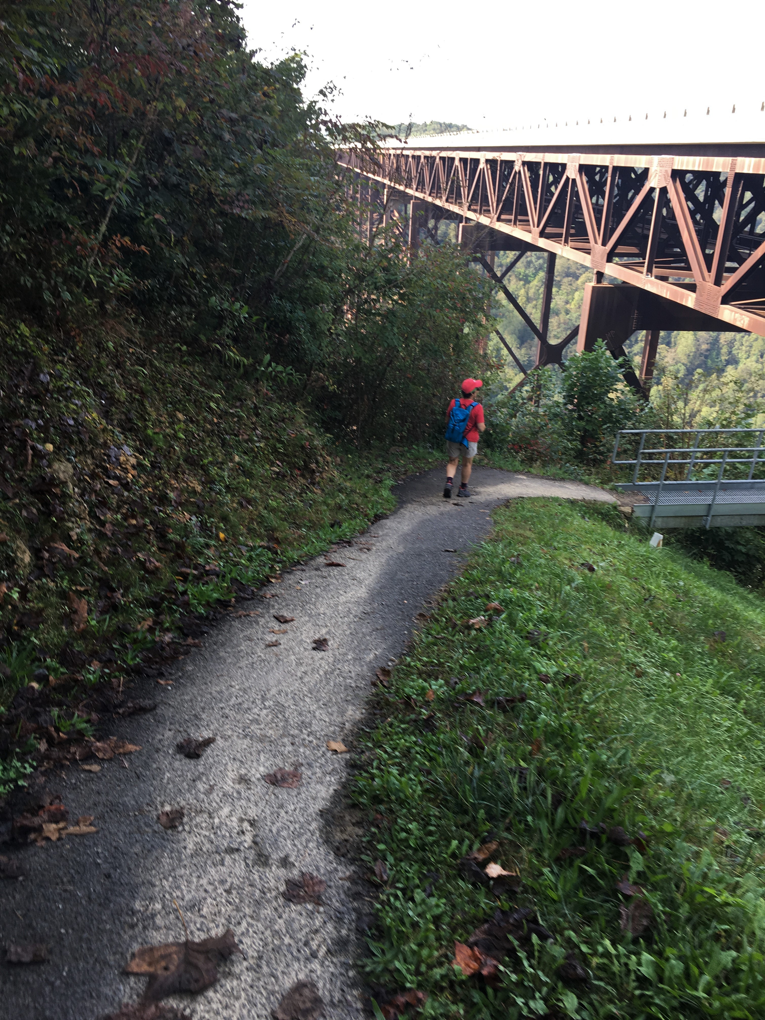 We then headed to Fayette Station because that is the first place I bring all of my friends who have never experienced FayCo before. It is a 100 year old road which has turns that are so sharp you can almost see your backside once traversed. This was the path to travel before the New River Gorge Bridge was built in the late 70s. Had I planned an itinerary, I might have found this jewel of a tidbit (which I will use the next time I visit): Audio Tour of Fayette Station Road. On this road there is a curve with a wide parking area to the side. Several … SEVERAL … nights as a teenager were spent parked there with my friends. Drinking, laughing and enjoying being rebels. Those were days before the over commercialization of the area in an attempt to draw in the tourists. I have nothing against tourists, mind you. But the area is a different beast in modern times compared to the days of my youth. Without stopping, the complete trip takes about 40 minutes (starting from Idiot’s Corner just past Canyon Rim Visitor Center and popping out just outside of Fayetteville on Rt. 19). The highlight of this crazy little road is the view of the New River Gorge Bridge from its bottomside. I’ll give you a more info on the bridge a little later in the blog. When you reach the river you cross a (much) smaller bridge before making the climb back up. The bridge is the Tunney Hunsaker Bridge. Tunney is a local sports legend who, later in life, was a police officer and Sunday School Teacher in Fayetteville. His sports claim to fame? He was Muhammed Ali’s opponent in Ali’s first professional fight. They remained good friends through life and in one of his memoirs, Ali noted that Hunsaker dealt him one of the hardest body blows he ever took in his career. Although that was a major moment in Hunsaker’s life, I am sure the fact that he was three times over named the Sunday School Teacher of the Year at the Church of the Nazarene gave him equal amounts of joy (and a considerably lesser amount of pain).
