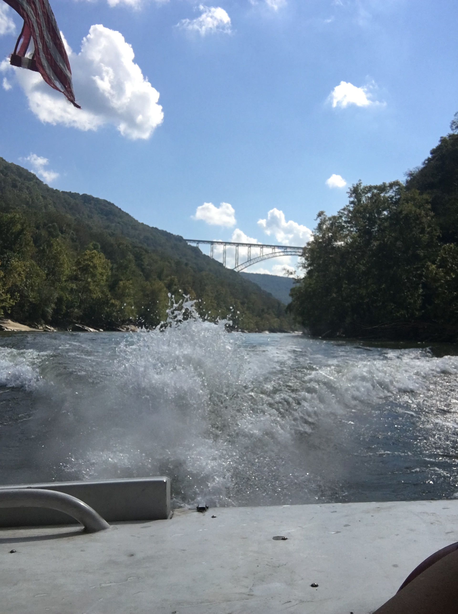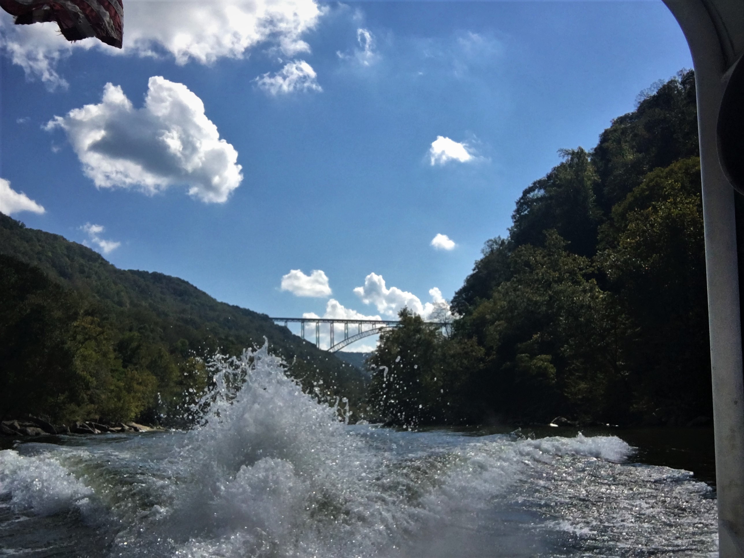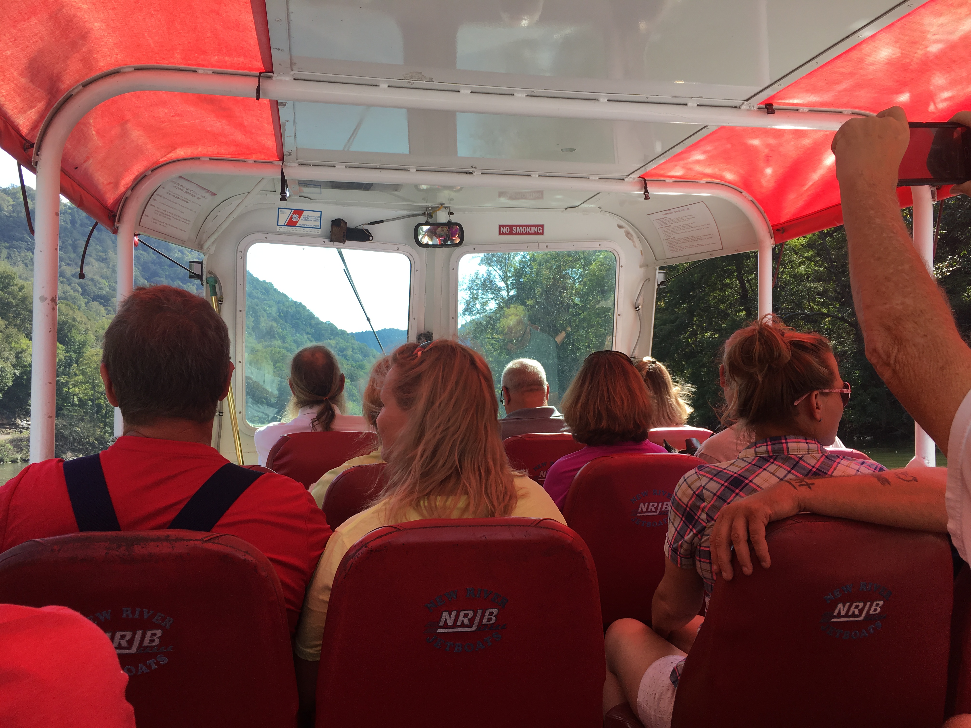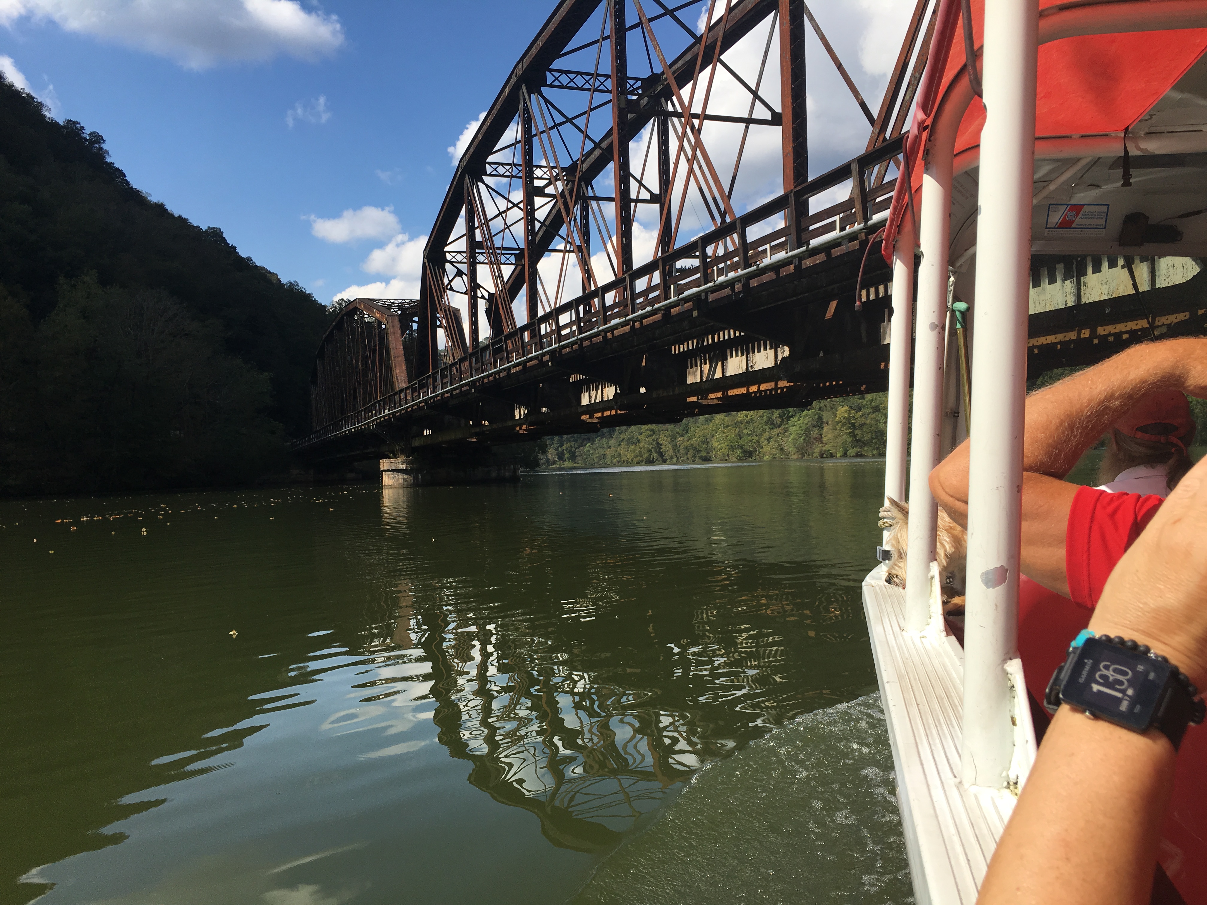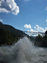 We made it to Hawks Nest and Judy purchased tickets for the tram to the bottom of the gorge where we would board a sight seeing boat. Once we reached the bottom we realized that the tickets were still in the tram! After a comedy of errors, and tickets in hand, we grabbed our seats on the boat. Although it was an entertaining ride, full of gorge splendor, we both would have preferred the boat to not smell like piss. Ugh! Once we rounded the bend and the NRG Bridge stood before us, it made the olfactory faux pas more bearable.